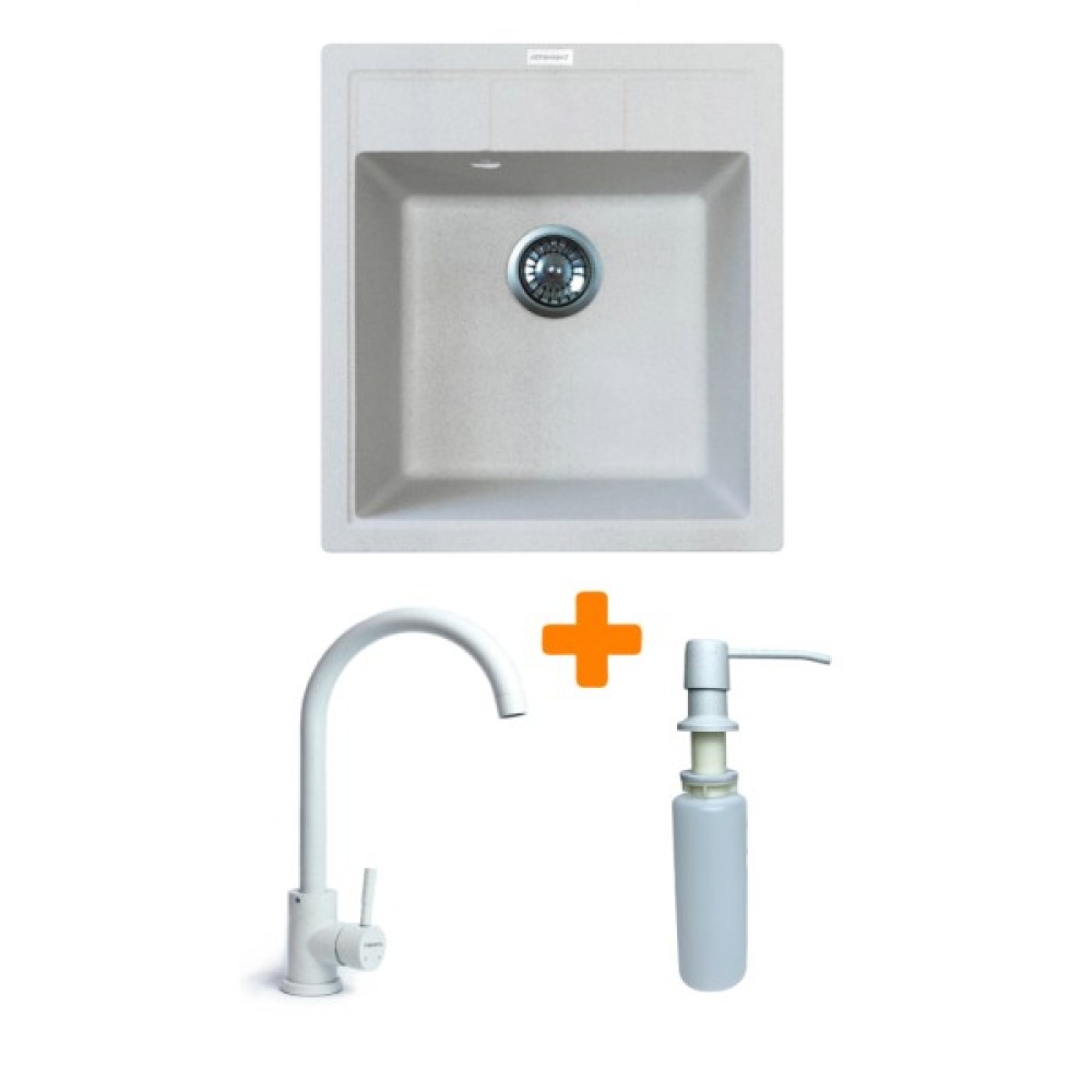 Набір Adamant Brick поєднує мийку зі штучного каменю, зручний кухонний змішувач та дозатор мийного засобу. Глибока квадратна чаша створює комфорт під час щоденного використання та легко очищується завдяки непористій структурі. Змішувач із нержавіючої сталі має плавний хід та можливість обертання виливу. Дозатор встановлюється у мийку або стільницю та дозволяє подавати мийний засіб одним натисканням. Це готовий комплект для сучасної та функціональної кухні.