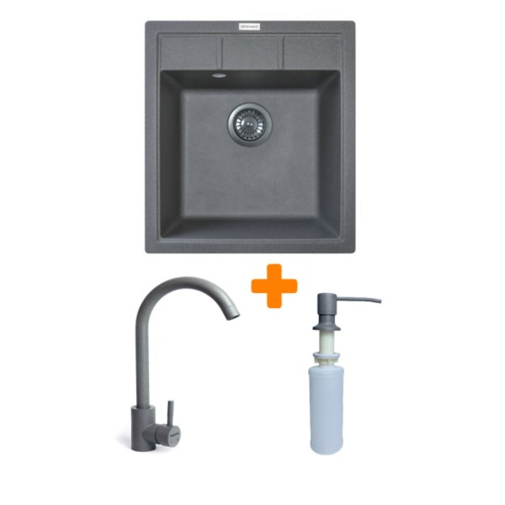 Набір Adamant Brick поєднує мийку зі штучного каменю, зручний кухонний змішувач та дозатор мийного засобу. Глибока квадратна чаша створює комфорт під час щоденного використання та легко очищується завдяки непористій структурі. Змішувач із нержавіючої сталі має плавний хід та можливість обертання виливу. Дозатор встановлюється у мийку або стільницю та дозволяє подавати мийний засіб одним натисканням. Це готовий комплект для сучасної та функціональної кухні.
