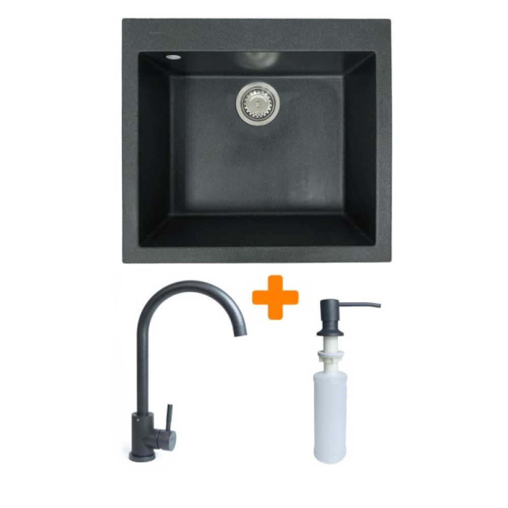 Набір Adamant Univer поєднує квадратну врізну мийку зі штучного каменю, змішувач та дозатор – зручне рішення для продуманої кухні. Технологія Solid Surface забезпечує міцність, термостійкість та простоту догляду. Глибока чаша створює комфорт під час щоденної роботи, а компактна конструкція без крила допомагає раціонально використовувати простір. Дозатор робить подачу мийного засобу акуратною та зручною, підтримуючи порядок у робочій зоні.