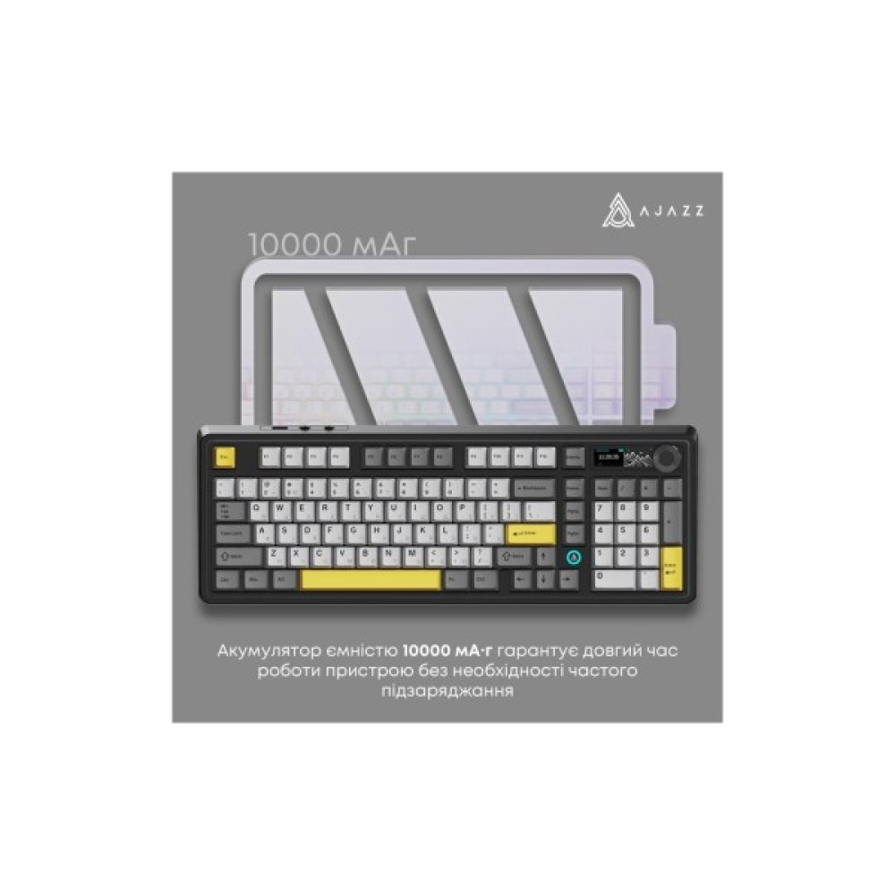 Ajazz AK980 V2 підтримує три режими підключення — дротове, 2.4 ГГц та Bluetooth, забезпечуючи максимальну гнучкість використання з різними пристроями. Потужний акумулятор 10000 мА*г гарантує тривалий час автономної роботи без частого заряджання.