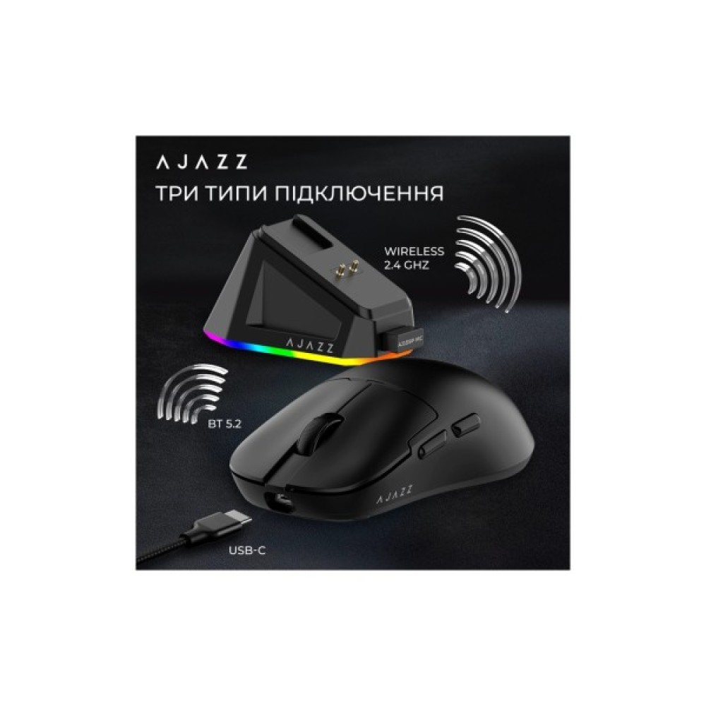 Мишка Ajazz AJ159P MC Wireless/Bluetooth/USB Charging Dock Black – це втілення високої продуктивності та сучасного дизайну, створена спеціально для геймерів, які цінують якість та новаторські рішення. Завдяки універсальним можливостям під'єднання, ця миша підходить для різних пристроїв, забезпечуючи бездоганну сумісність з ПК, ноутбуками та Mac. Ви отримуєте можливість насолоджуватися грою та роботою без перебою, використовуючи як бездротове, так і дротове підключення.