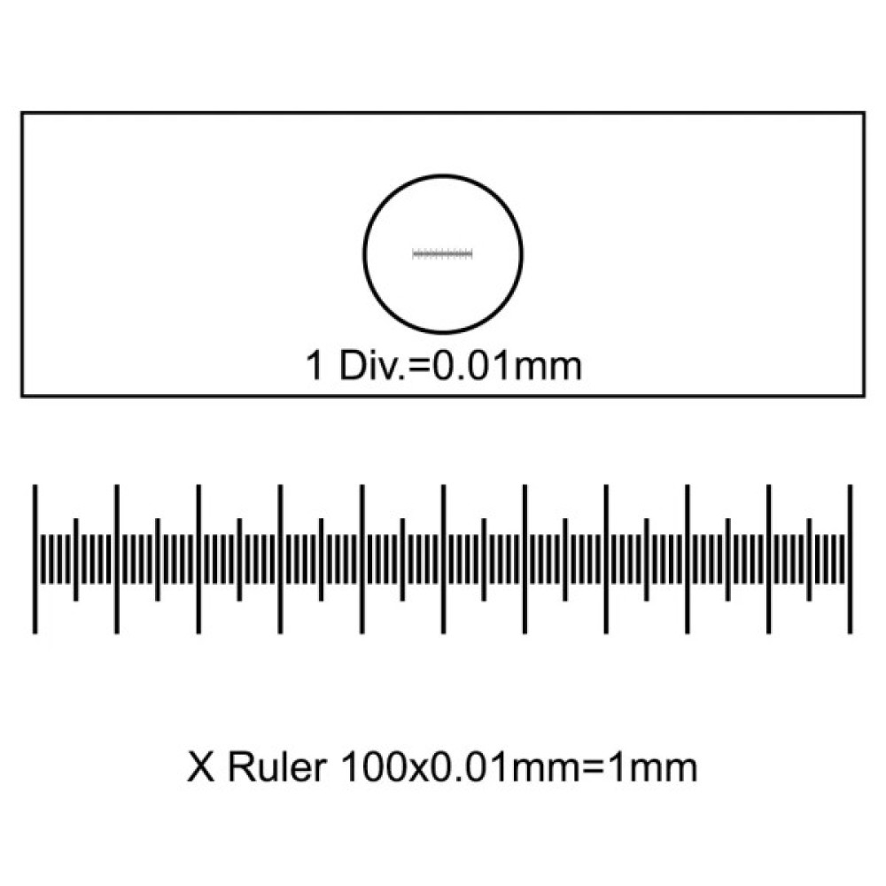 Калібрувальна лінійка SIGETA Slide-1 X 0.01 мм – це предметне скло зі шкалою (мікрометр), яке використовується для точного вимірювання об'єктів, які досліджуються, і отриманих зображень за допомогою мікроскопа або цифрової камери-окуляра.