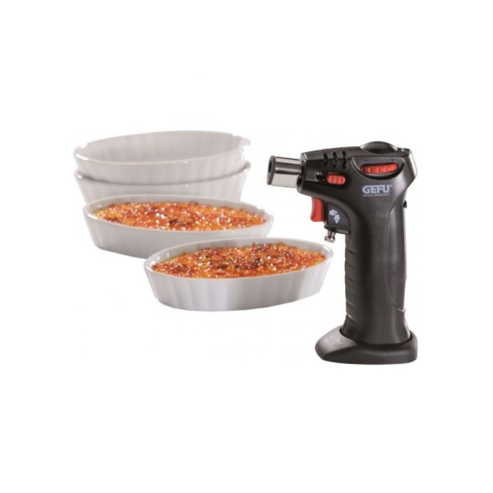 Набір GEFU CREME BRULEE CARMELLO включає 5 предметів: регульований газовий пальник (регульований розмір полум'я, можливість поповнення) і чотири овальні жароміцні порційні форми з порцеляни. Цей набір ідеально підходить для карамелізації, підрум'янювання, приготування «гриль» і створення хрусткої скоринки на ваших десертах, як у професійних кондитерів. Має стабільну основу та блокування від дітей.