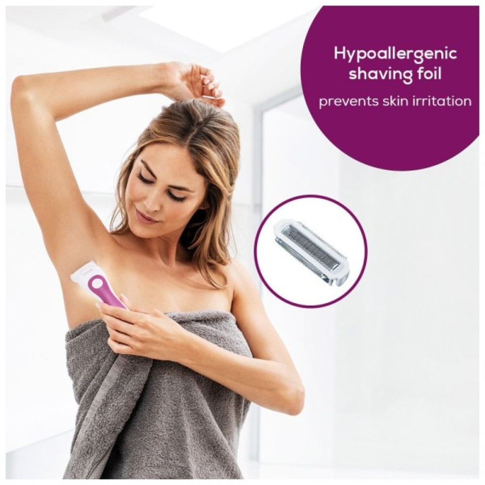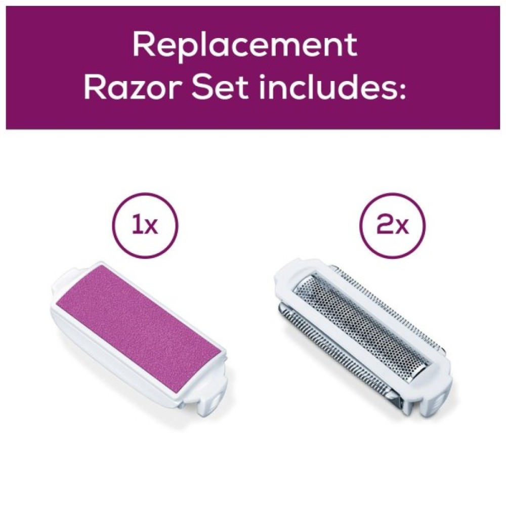 У комплекті дві сітки з лезами для гоління і одна насадка для пілінгу. Гіпоалергенна сітка бритви запобігає подразненню шкіри. Рекомендується заміна кожні 12 місяців.