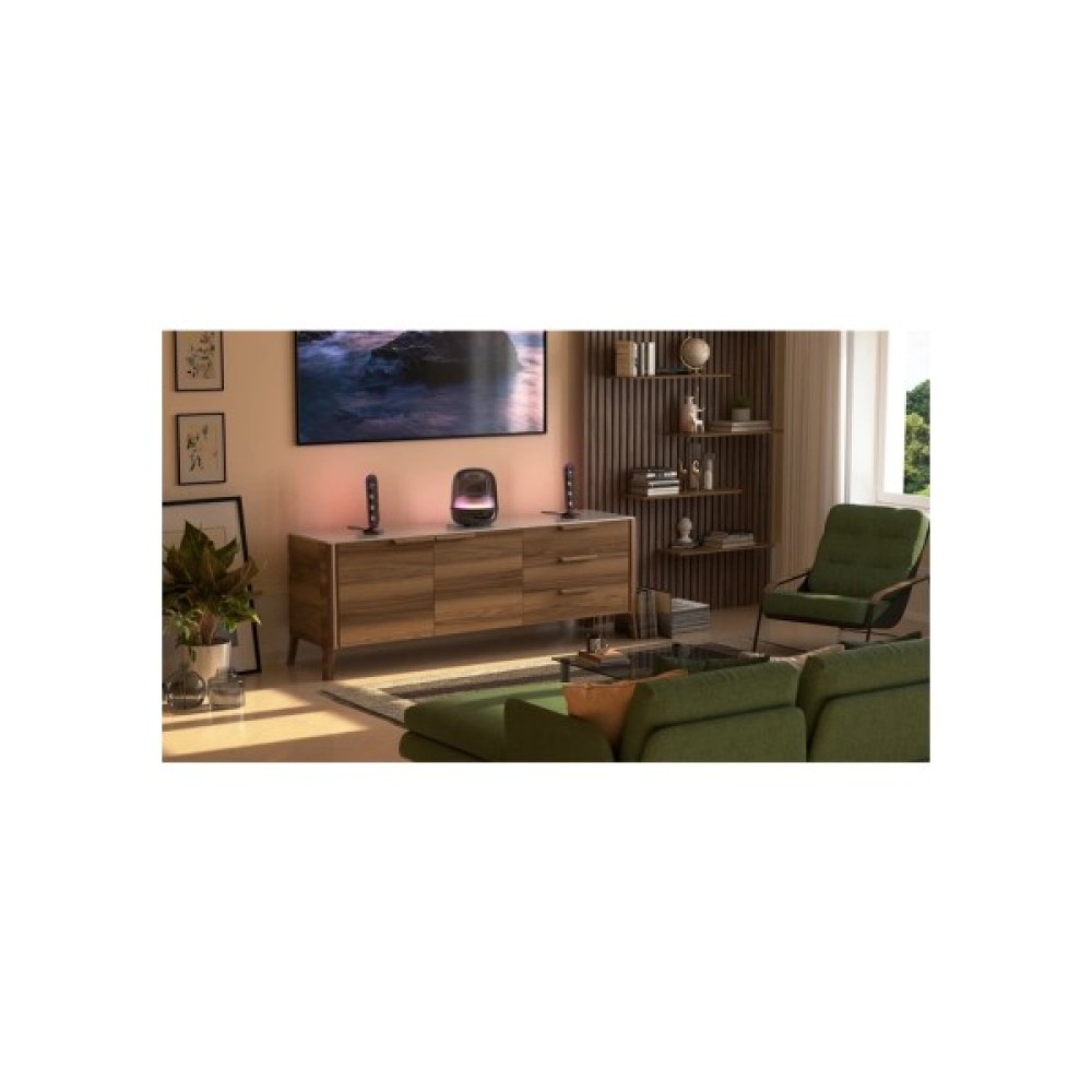 Наповніть свій дім насиченим звуком, світлом і вічним дизайномУявіть собі затишну вечерю з друзями, коли музика звучить так само легко й невимушено, як і розмова. Або проведіть теплий вечір удвох, увімкнувши улюблений романтичний плейлист і створивши атмосферу завдяки м’якому підсвічуванню. Завдяки культовому прозорому куполу та елегантним вигинам Harman Kardon SoundSticks 5 надає будь-якому інтер’єру позачасовий стиль. Сателітні динаміки та сабвуфер створюють захопливе світлове шоу з яскравими кольорами та динамічними, плавними рухами, що відповідають вашому настрою та підсилюють враження від прослуховування.