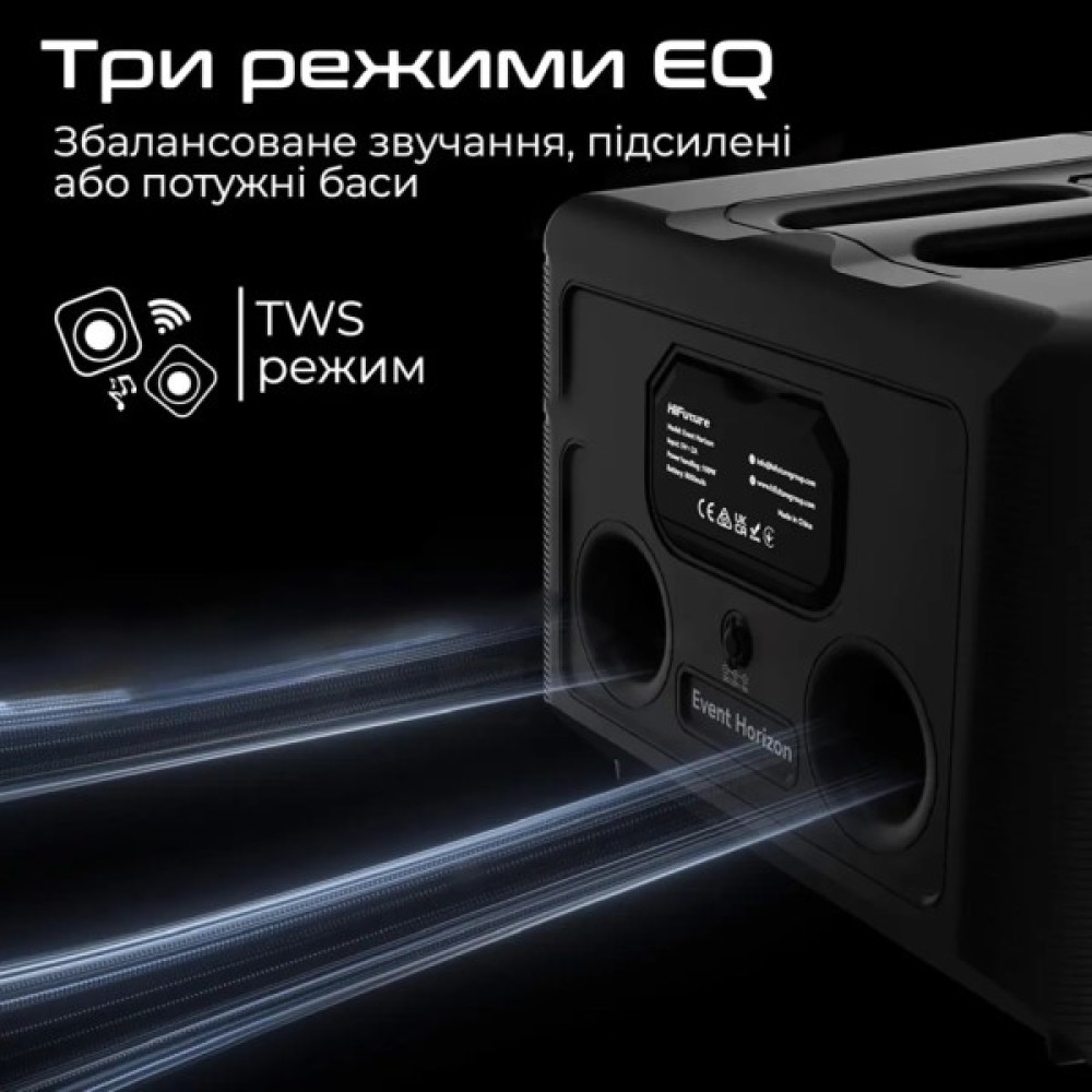 HiFuture Event Horizon забезпечує бездротове підключення через Bluetooth 5.3, гарантуючи стабільне з'єднання на відстані до 10 метрів. Для додаткової зручності колонка підтримує TWS (True Wireless Stereo), що дозволяє підключити два пристрої для справжнього стерео-ефекту.