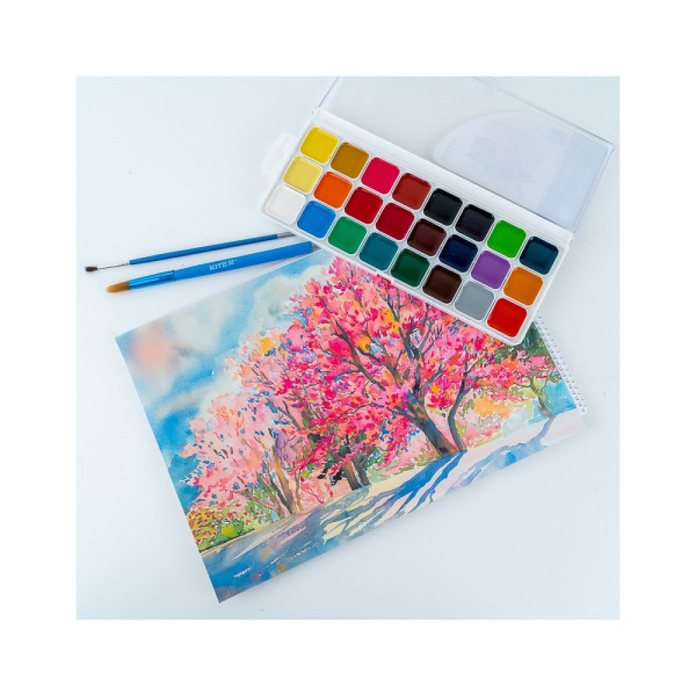 Медові напівсухі акварелі Kite – яскраві та насичені, чудово змішуються між собою, створюючи нові відтінки. Фарби прекрасно розмиваються водою, набуваючи чарівної прозорості, за яку так цінуються акварелі. Текстура – приємна та однорідна, фарби легко набираються на пензель та рівномірно наносяться на поверхню паперу.