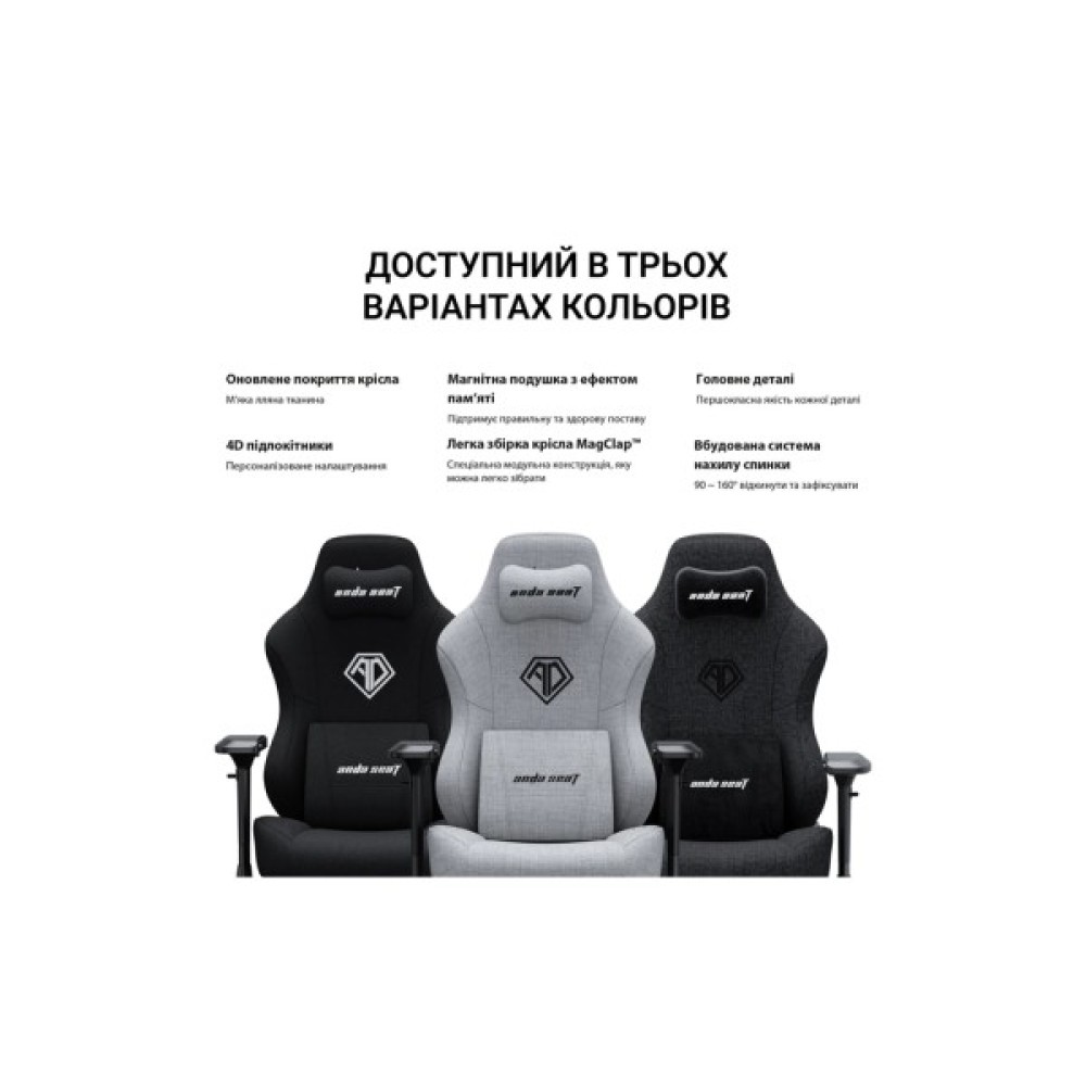 Оббивка виконана з темно-сірого текстилю, що додає кріслу стильного, сучасного вигляду, та забезпечує приємні тактильні відчуття. Цей матеріал добре пропускає повітря і легко очищується від забруднень, що робить його ідеальним вибором для тривалого користування. Використання технології MagClap полегшує процес складання, роблячи його доступним навіть для людей без досвіду у цьому.