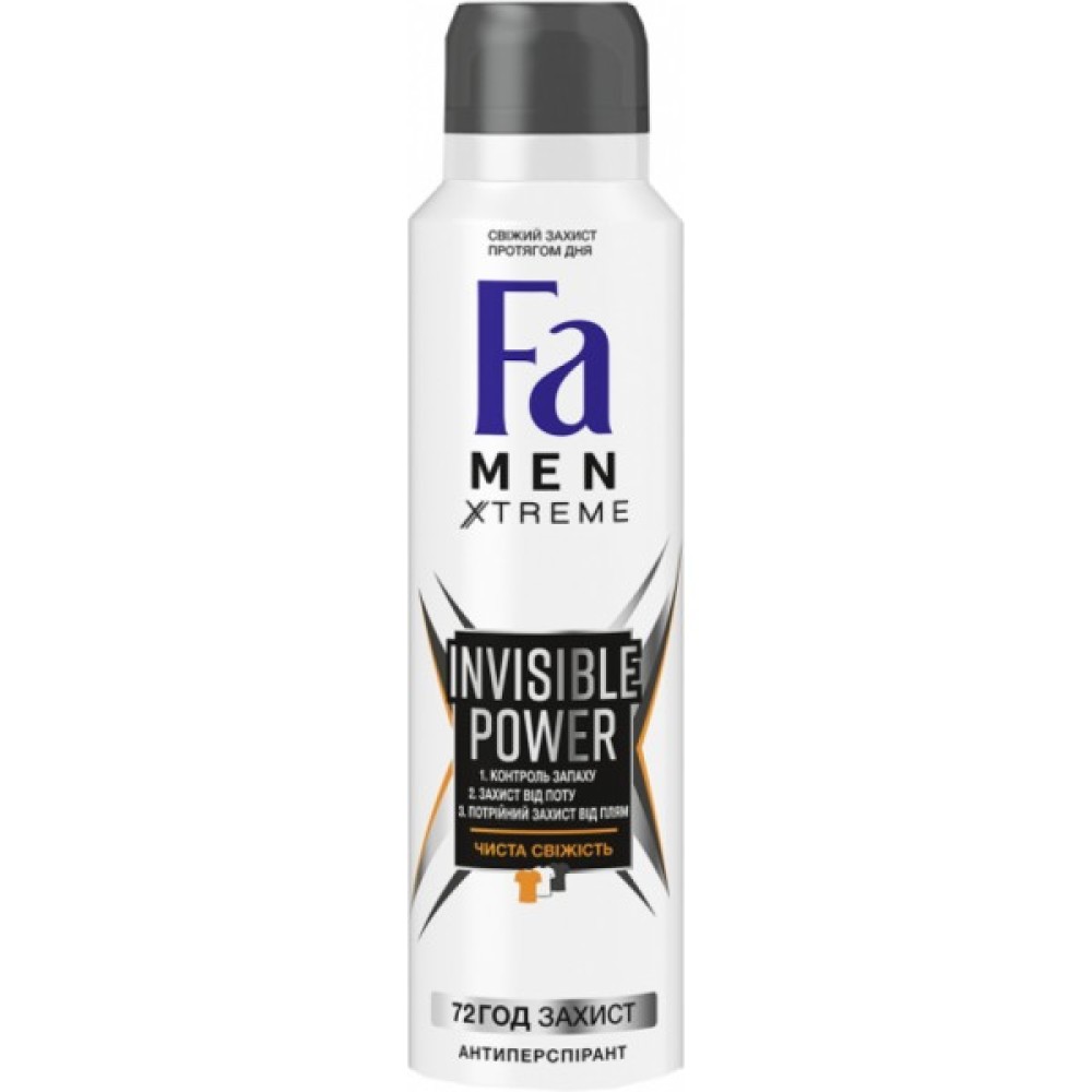 Екстремальний захист від запаху поту та плям: Fa Men Xtreme Invisible Power! Високоефективний антиперспірант з інноваційною технологією виявлення поту негайно виявляє піт за перших ознак його появи та забезпечує екстремальний захист від мокрих пахв і неприємного запаху впродовж 72 годин. Запобігає появі трьох найпоширеніших плям, асоційованих із використанням дезодорантів — жовтих плям на кольоровому і білому одязі, білих плям на кольоровому і чорному одязі та олійних плям.