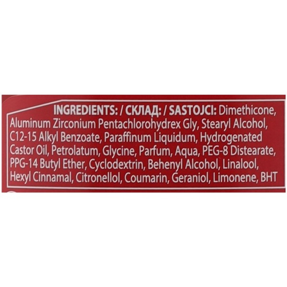 Склад Dimethicone, Aluminum Zirconium Pentachlorohydrex Gly, Stearyl Alcohol, C12-15 Alkyl Benzoate, Paraffinum Liquidum, Hydrogenated Castor Oil, Petrolatum, Glycine, Parfum, Aqua, PEG-8 Distearate, PPG-14 Butyl Ether, Cyclodextrin, Behenyl Alcohol, Linalool, Hexyl Cinnamal, Citronellol, Coumarin, Geraniol, Limonene, BHT