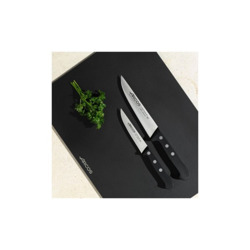 Ніж для чищення Universal від іспанського виробника Arcos виготовлений із кованої сталі NITRUM, яка є ексклюзивним винаходом компанії. Вона збагачена азотом і тому довговічна, несприйнятлива до корозії і довго не вимагає заточування. Не менш технологічна руків'я з поліпропілену . Інноваційний матеріал має дивовижні ударостійкі властивості. У цій моделі застосований двосторонній симетричний тип заточування. Завдяки цьому гострота ножа практично ідеальна, а початкова ріжуча здатність зберігається триваліший час.
