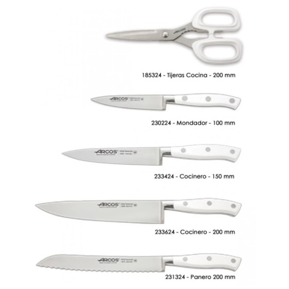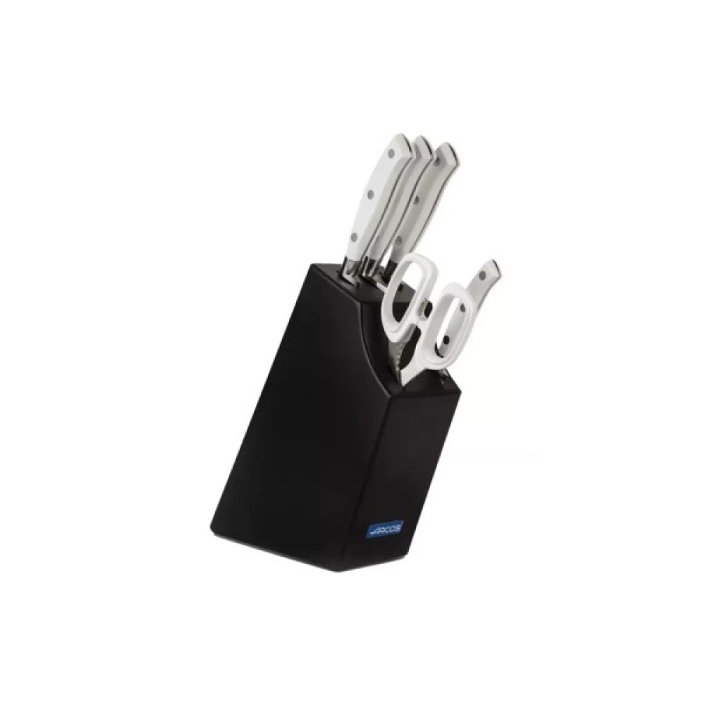 Набір ножів із 5-ти предметів з підставкою Arcos Riviera White призначений для професійного та домашнього використання. Набір кованих ножів Arcos Riviera White у дерев’яній підставці стане чудовим подарунком для поціновувачів стилю та якості. Витончена білосніжна ручка та довершений дизайн леза надихнуть та заохотять cтворити страви різної складності, зробивши процес готування ще кращим і захоплюючим.