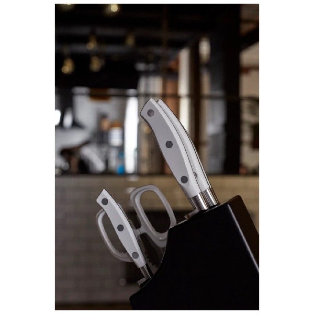 Руків'я професійних ножів серії «Рів’єра Біла» з витонченим дизайном виготовили з поліоксиметиленових накладок, які не створюють щілин та запобігають проникненню мікроскопічних елементів їжі. Закріплюють конструкцію рукоятки ножів з набору для кухні міцні металеві заклепки, що сприяють довготривалій роботі з ножем на кухні. Больстер розташовується на передній частині руків'я та зменшує навантаження на руку повара під час нарізання. Руків'я пройшло антибактеріальну обробку, стійка до кислот, хлору, миючих засобів та високих температур.