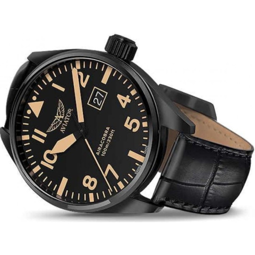 Під час Другої світової війни забезпечення авіаційної підтримки літаками Airacobra було запорукою успіху сухопутних операцій. Годинник AVIATOR Airacobra P42 не поступається своєму авіаційному прототипу за надійністю і витриманий у такому ж ретро стилі, як і легендарний військовий літак. При створенні AVIATOR Airacobra P42 використовуються найкращі та найпрестижніші матеріали, що забезпечує годинникам військову точність і класичний вигляд. Своєю високою контрастністю стрілки та годинникові мітки нагадують оформлення кабіни пілота. У годинника добре читається циферблат, велике вікно індикації дати і кришка корпусу з клепаними елементами. Все це надає годинникам Airacobra P42 виняткову надійність і в той же час дозволяє увічнити в них пам'ять про віхи в історії авіації.