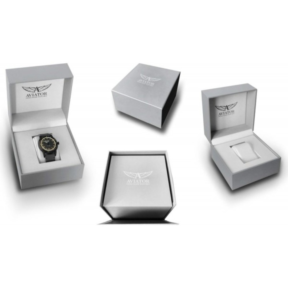 Своєю матовою зернистою обробкою циферблат годинника нагадує прилади з кабіни пілота. Лаконічні, висококонтрастні стрілки і годинникові мітки забезпечують чудову чіткість і читання зображення, а збільшене вікно індикації дати в районі тригодинної позначки ще більше посилюють схожість моделі з авіаційним приладом. Як і у всіх інших годинниках AVIATOR всі деталі цієї моделі ретельно продумані, надаючи їй навіяний авіацією оригінального вигляду.