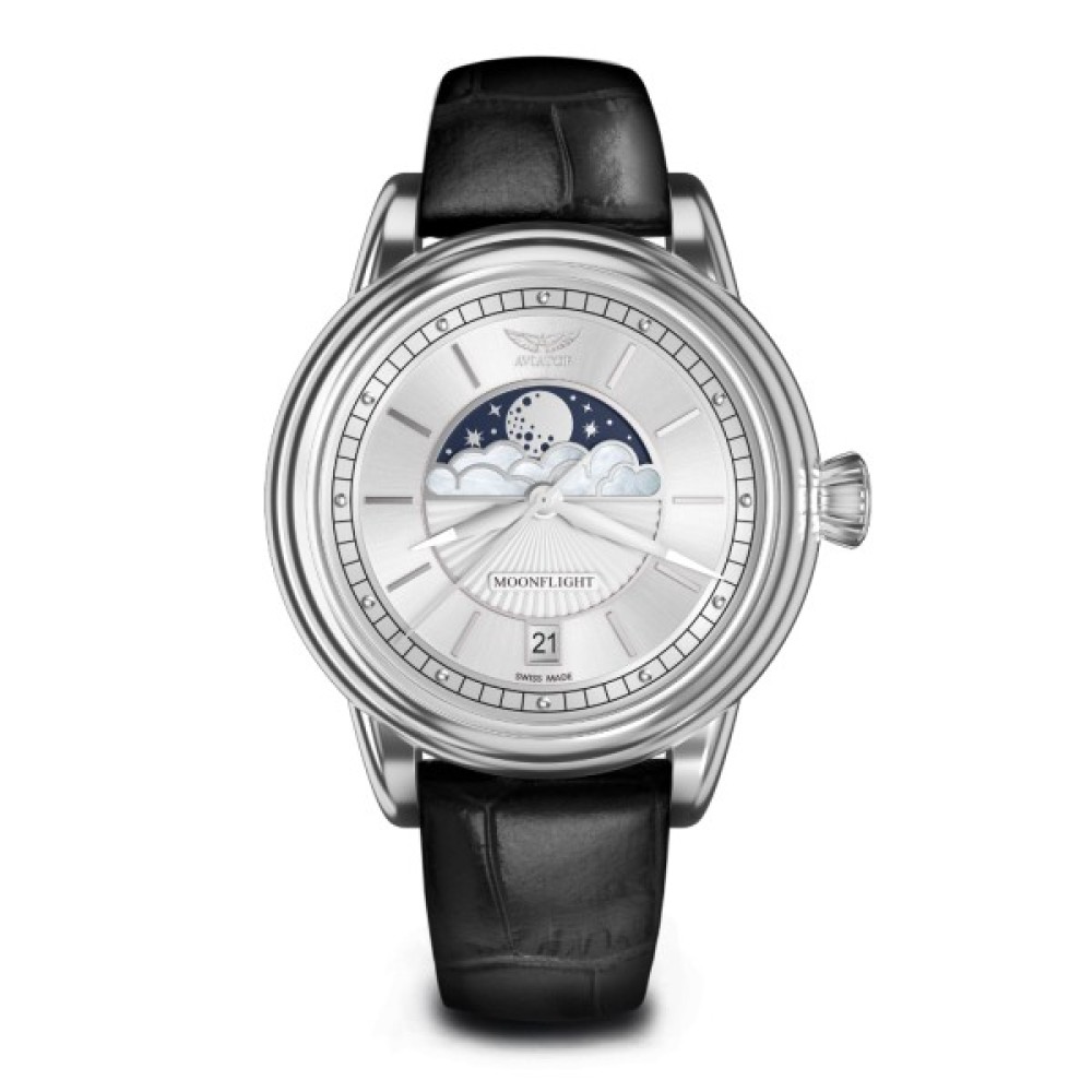 У колекції годинника AVIATOR MoonFlight класичні елементи стилю ар-деко ефектно поєднуються з фазами Місяця. моделі, що ввійшли до неї, присвячені кращому літаку тих часів. З ними ви будете оточені зірками у вишуканій атмосфері від-кутюр.