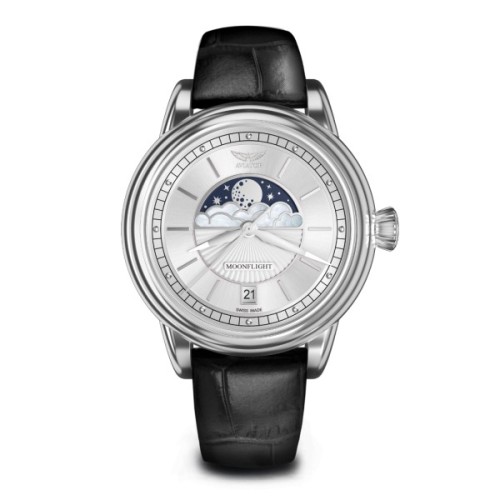 З настанням «золотого століття» авіації властиві мандрівкам того часу вишуканість і розкіш досягли нових висот. До проектування літаків підключилися провідні кутюр'є, ідеї яких знаходили відображення у всьому, від форми фюзеляжу до форменого одягу екіпажу. Особливо комфортними були нічні рейси на борту літака Douglas DC-3, під час яких пасажири могли від заходу сонця до світанку милуватися Місяцем. Розкіш і містика Місяця лягли в основу витончених годинників AVIATOR MoonFlight. Урожайна кольорова гама, відполіровані чіткі лінії та гільошовані візерунки типу «сонячні промені» – всі ці елементи відсилають нас до 1930-х років. Хмари виконані з чудового перламутру, поєднуючи красу простих форм з модними тенденціями, а місячний диск і нічне небо постають у всій своїй красі.