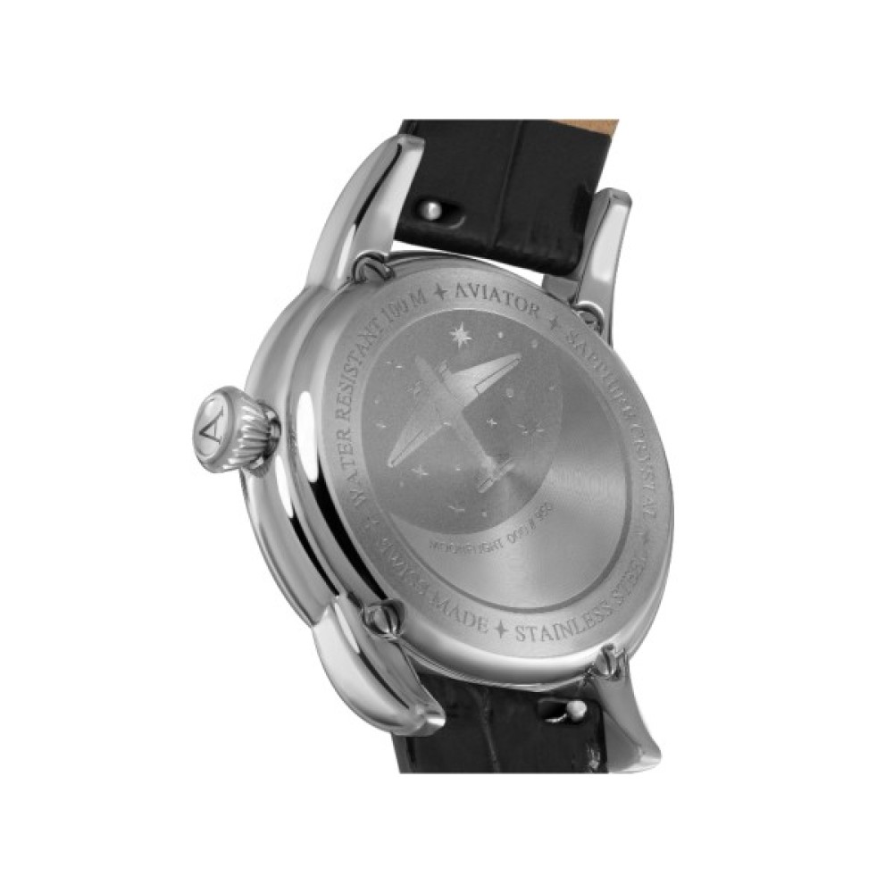 Кожна модель AVIATOR має свою історію. Погляньте на кришку корпусу годинника MoonFlight та побачите вигравіроване зображення літака Douglas DC-3 у таємничому місячному світлі. Зображення оживає завдяки застосуванню безлічі технік обробки, а саме гравірування трохи втиснуте в кришку, що надає їй додаткової витонченості. Кришка надійно закріплена на корпусі сталевими гвинтами, а значить, ви можете почати з занурення у воду, де виглядатимете не менш елегантно, адже годинник водонепроникний на глибині до 100 метрів.