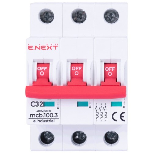 Модульний автоматичний вимикач e.industrial.mcb.100.3.C32, 3 г, 32А, C, 10кА призначений для захисту низьковольтних електричних мереж та обладнання від струмів навантаження та короткого замикання, а також нечастих оперативних комутацій електричних мереж. Виріб відповідає Технічним регламентам безпеки низьковольтного електричного обладнання та електромагнітної сумісності обладнання ДСТУ IEC 60947-1:2008, ДСТУ IEC 60947-2:2008, ДСТУ IEC 60898-1:2005