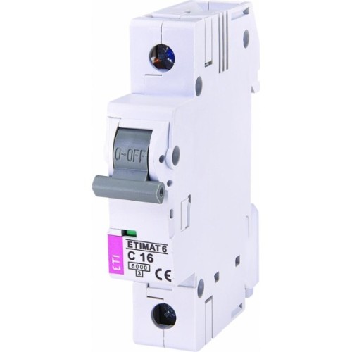 Автоматичний вимикач (автомат) ETI серії ETIMAT 6 призначений для захисту низьковольтних електроланок змінного струму від перевантаження і короткого замикання і допоможе зробити ваш будинок або офіс безпечним. Пристрій працює при номінальному струмі 16 A і характеризується відключає здатністю в 6 kA. Конструкція вимикача має спеціальне кріплення на DIN-рейку, завдяки чому встановити пристрій можна без застосування інструментів і демонтажу шинної збірки. Також виробник передбачив можливість підключення шини харчування і провідника як зверху, так і знизу автомата, що сприяє зручності його використання. Продукція компанії ETI відмінно проявляє себе в експлуатації, а її якість підтверджується наявністю міжнародних сертифікатів і безліччю нагород.
