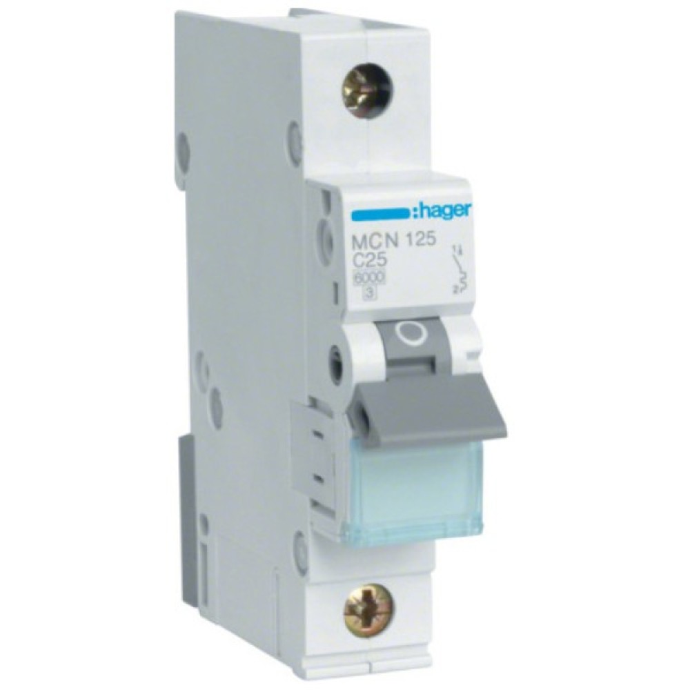 Автоматичні вимикачі Hager - сучасні модульні пристрої захисту кабелів і проводів від перевантажень і коротких замикань. Продуманість конструкції автоматичних вимикачів Hager дозволяє без застосування інструментів встановлювати на пристрої додаткові аксесуари, такі як незалежні роз'єднувачі і роз'єднувачі мінімальної напруги. Автоматичні вимикачі Hager знайшли широке застосування в системах енергорозподілу і захисту в житловому будівництві. Автомати Hager є важливою елементної базою при серійному виробництві щитового обладнання для промислового використання в рамках систем промислової автоматизації, вентиляційного обладнання, систем забезпечення безперебійного живлення, систем промислового електрообігріву і т.д.Автоматичний вимикач Hager 1P 25A C 6kA ( MCN125 ) характеристики: