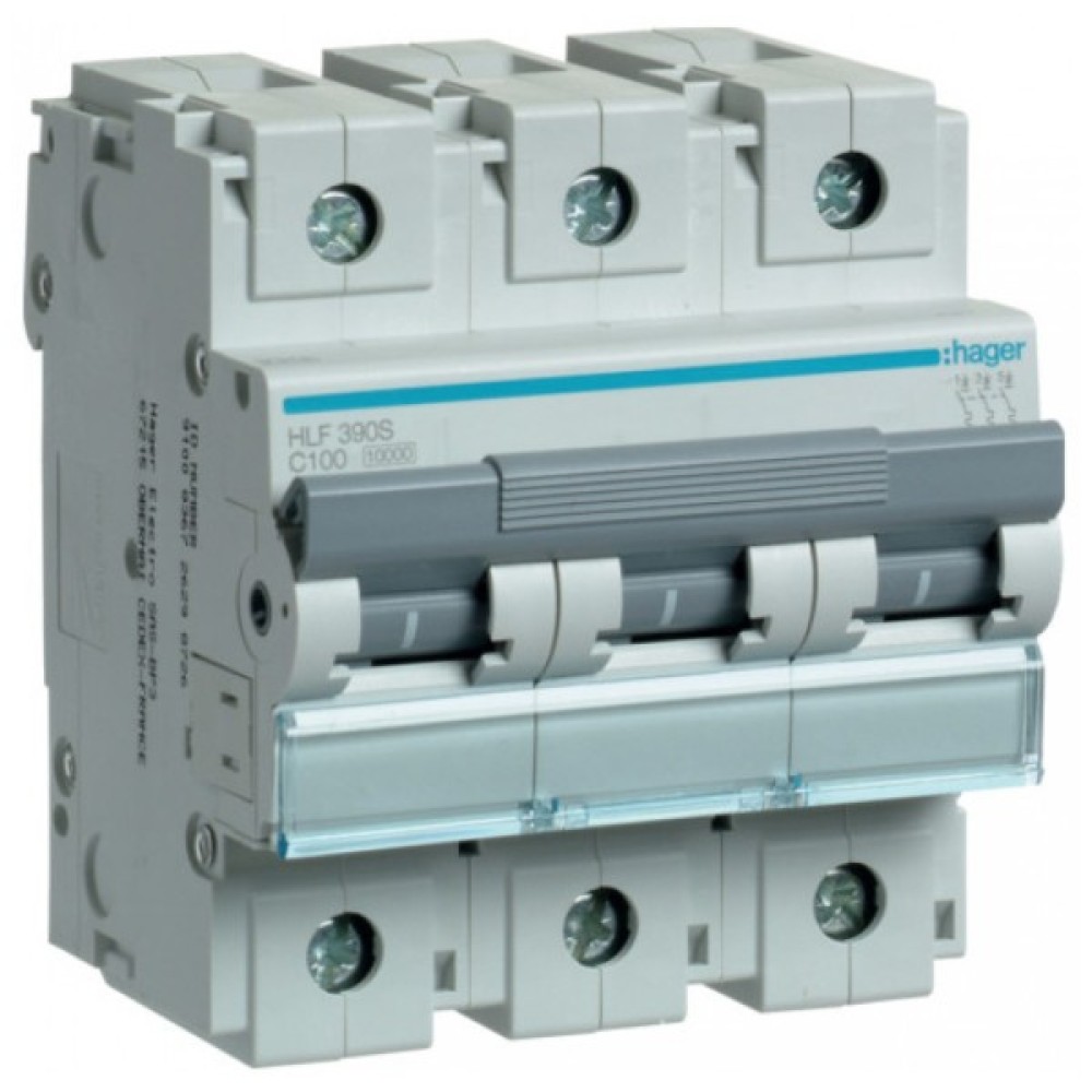 Автоматичний вимикач 100 А Hager HLF390S , трифазний, характеристика відключення С використовується для надійного захисту електричних ланцюгів змінного та постійного струму від навантаження та струмів КЗ. Лінійний автоматичний захисний вимикач 100 ампер HLF390S Hager відповідає суворим європейським нормам в галузі електротехніки: IEC898, EN60898, DIN VDE0641 частина 11/8.92.