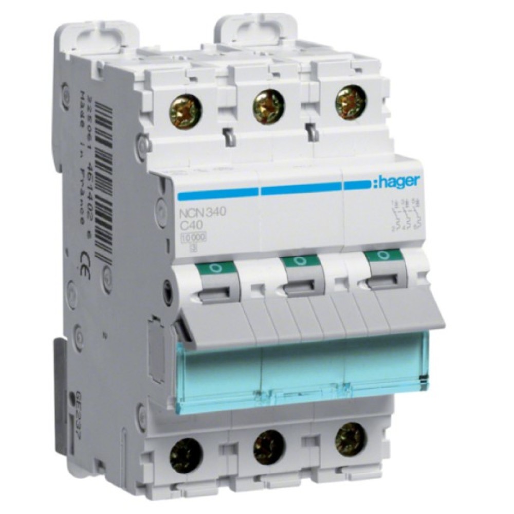 Hager NCN340 – модульний автоматичний вимикач серії N, що відповідає високим стандартам якості, на 3 полюси від всесвітньо відомої торгової марки Hager. Модель йде з номінальним струмом 40 Амперів і характеристикою спрацьовування розчіплювача C. Розрахункова напруга 380 Вольт, здатність відключати 10kA. Нейтральне становище: без нейтралі. Всі компоненти вимикача винятково високої якості, через що термін механічної зносостійкості досягає приголомшливої позначки 20 000 циклів.