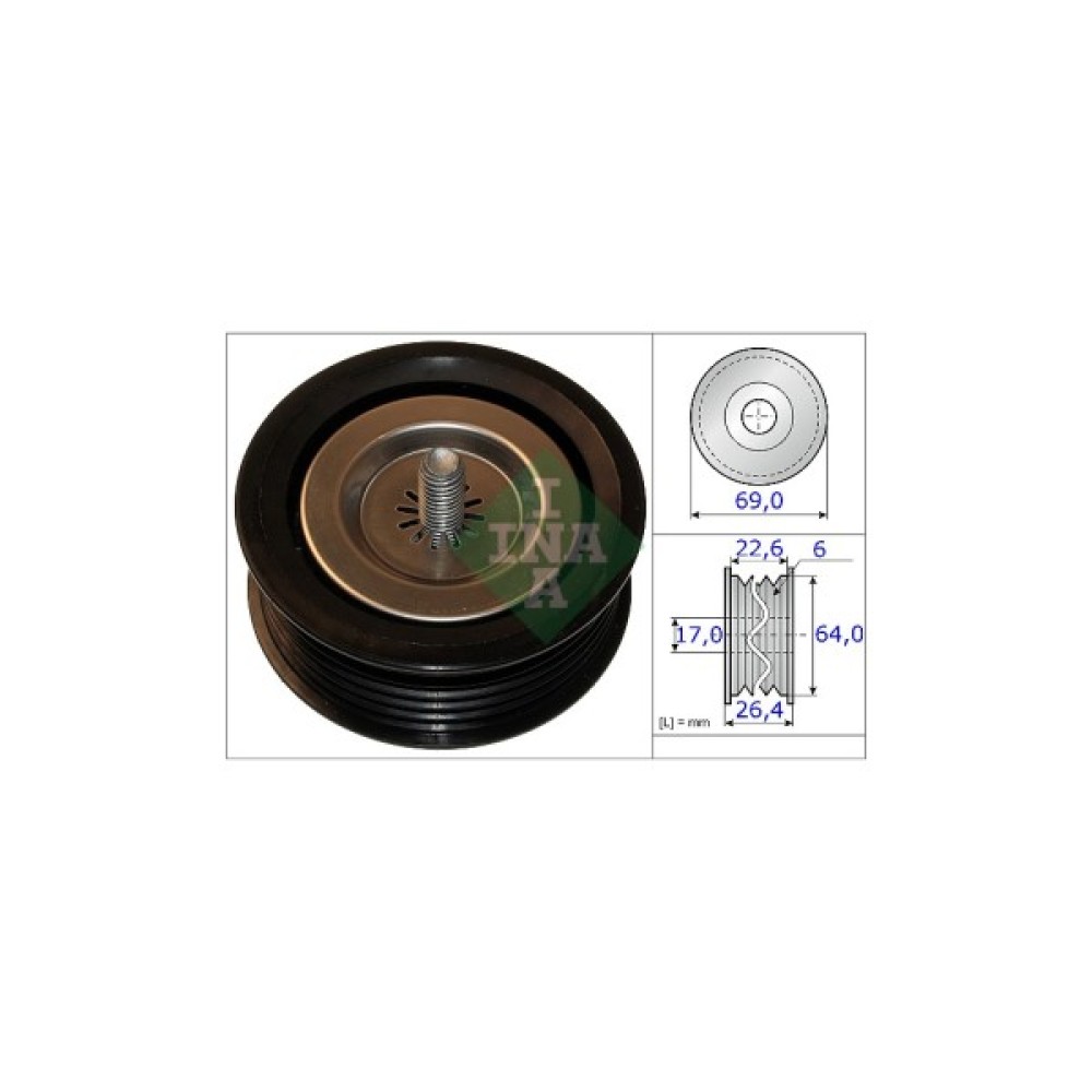 Натяжний ролик ременя поліклинового (приводного) INA 532 0671 10 дозволить зробити заміну зношеної/зламаної деталі, поліпшити ступінь натягу ременя, а також стабільність роботи приводу ГРМ та двигуна автомобіля. Всі деталі ролика виконані з матеріалів, високої якості, що дозволить забезпечити тривалий термін експлуатації деталі. Зовнішній діаметр становить 69 мм. Деталь має висоту 26.5 мм.