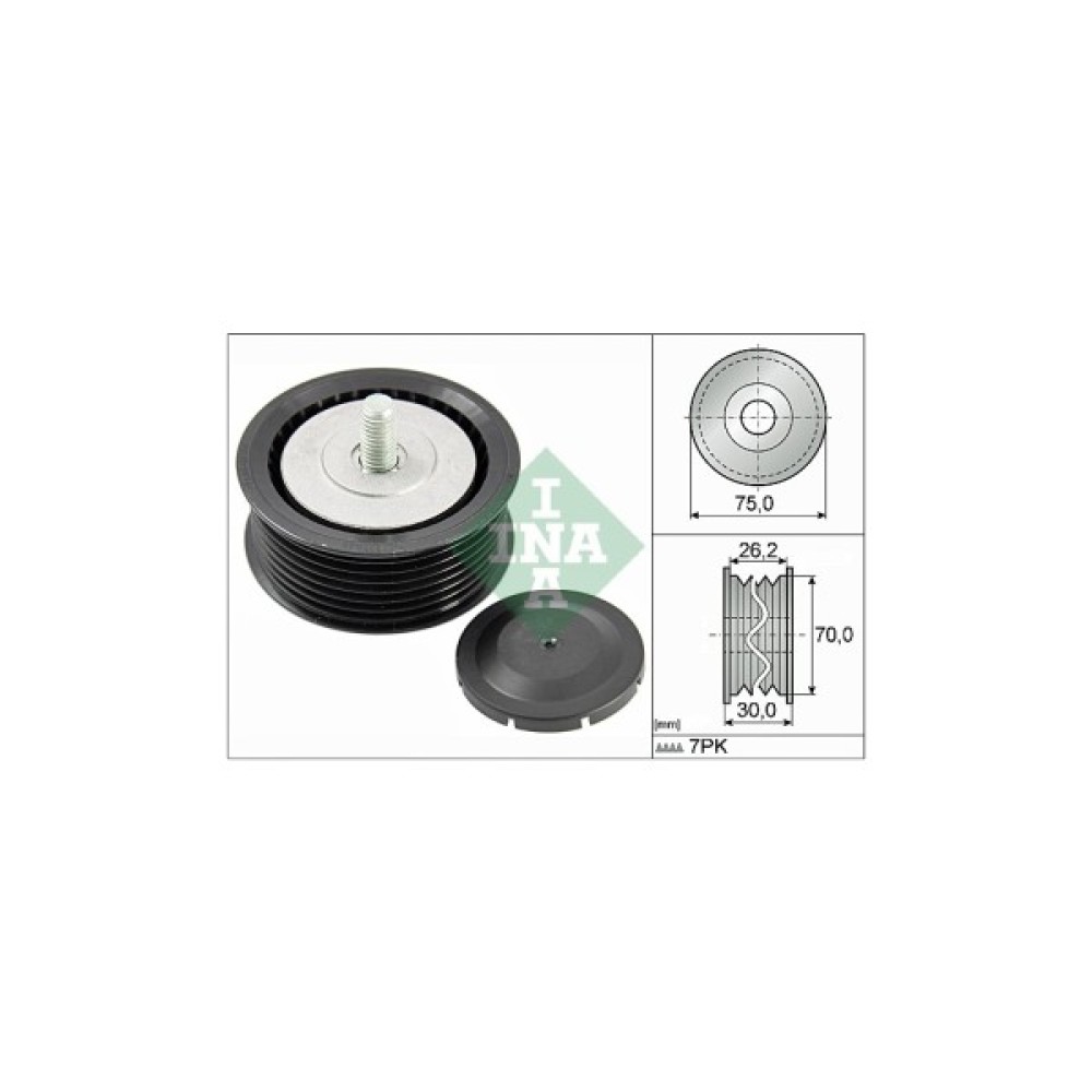 Обвідний ролик ременя поліклинового (приводного) INA 532 0800 10 дозволить зробити заміну зношеної/зламаної деталі, поліпшити ступінь натягу ременя, а також стабільність роботи приводу ГРМ та двигуна автомобіля. Всі деталі ролика виконані з матеріалів, високої якості, що дозволить забезпечити тривалий термін експлуатації деталі. Зовнішній діаметр становить 75 мм. Деталь має висоту 30 мм.