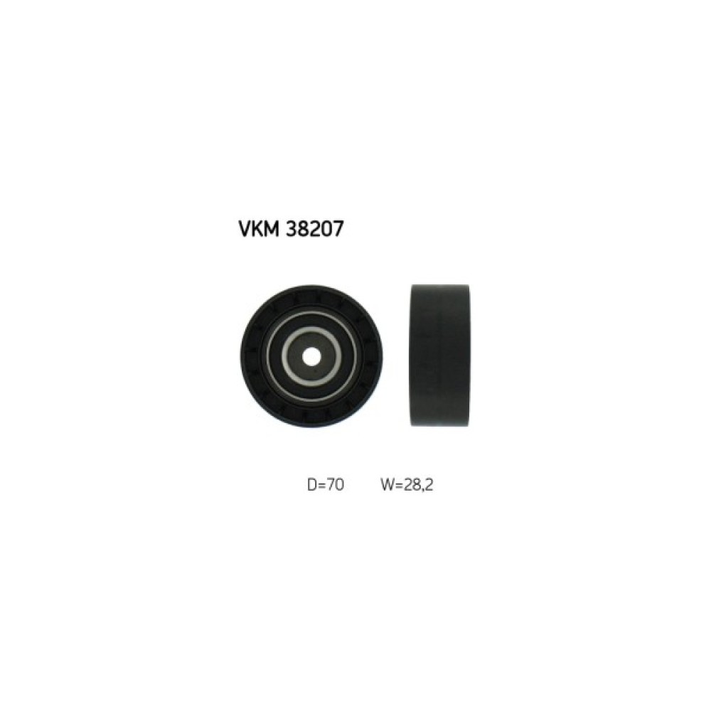 Обвідний ролик ременя поліклинового (приводного) SKF VKM 38207 дозволить зробити заміну зношеної/зламаної деталі, поліпшити ступінь натягу ременя, а також стабільність роботи приводу ГРМ та двигуна автомобіля. Всі деталі ролика виконані з матеріалів, високої якості, що дозволить забезпечити тривалий термін експлуатації деталі. Зовнішній діаметр становить 70 мм. Деталь має висоту 28.2 мм.