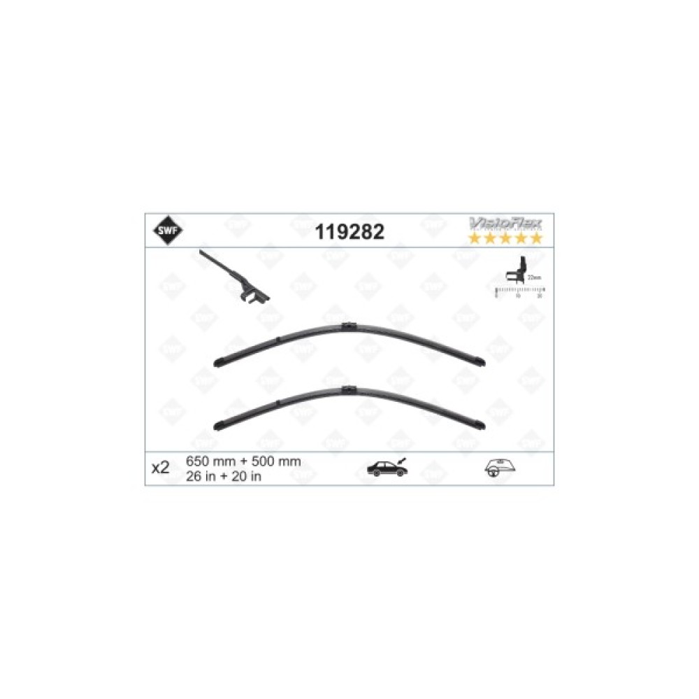 Щітка склоочисника SWF SF 119282 має високу якість і зносостійкість. У комплекті йде дві щітки довжиною 650 мм та 500 мм. Щітка є бескаркасною. Говорячи про виробника, варто відзначити, що дана німецька компанія має прекрасну репутацію на ринку автомобільних запчастин. І це виправдано, адже якість і довговічність кожного виробленого компанією SWF продукту важко переоцінити. Крім того, фірмові запчастини SWF також є на конвеєрах виробників Volvo, Nissan, Renault, Citroen, Mercedes, Peugeot, GM, BMW, VAG, Daimler-Chrysler, Audi, VW.