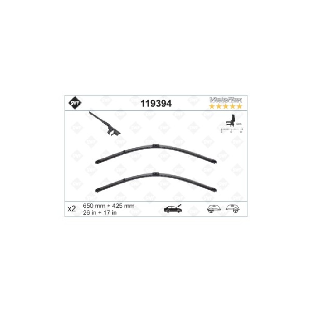 Щітка склоочисника SWF SF 119394 має високу якість і зносостійкість. У комплекті йде дві щітки довжиною 650 мм та 420 мм. Щітка є бескаркасною. Говорячи про виробника, варто відзначити, що дана німецька компанія має прекрасну репутацію на ринку автомобільних запчастин. І це виправдано, адже якість і довговічність кожного виробленого компанією SWF продукту важко переоцінити. Крім того, фірмові запчастини SWF також є на конвеєрах виробників Volvo, Nissan, Renault, Citroen, Mercedes, Peugeot, GM, BMW, VAG, Daimler-Chrysler, Audi, VW.
