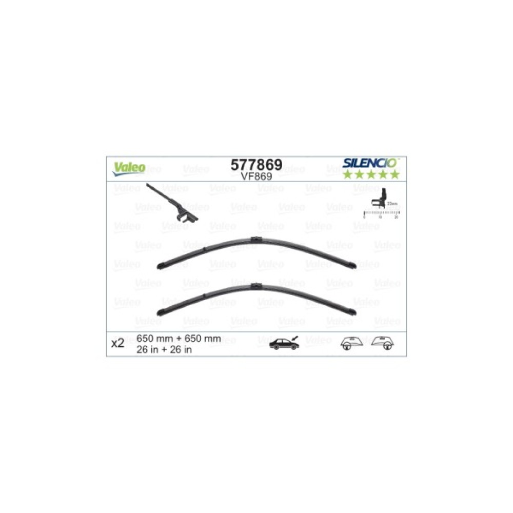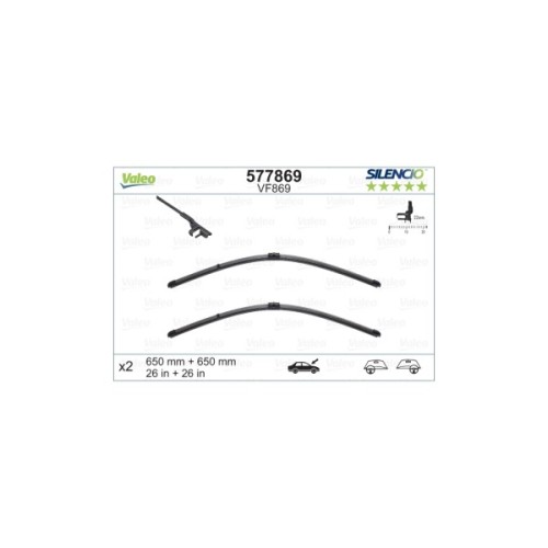 Безкаркасні склоочисники Valeo 577869 650х650мм виготовлені з сировини високої якості. В основу безкаркасної конструкції входить пружна металева пластина, яка забезпечує щільний притиск двірника по всій поверхні вітрового скла не залежно від радіуса його кривизни. Дана пластина повністю захована в корпус, що виключає виникнення корозії і продовжує термін служби. Сам корпус виготовлений у вигляді спойлера, для додаткового притиску на високій швидкості. Лезо склоочисника нейтрально до впливу компонентів омивача скла, воно зберігає свою м'якість і еластичність при тривалому впливі сонячних променів.