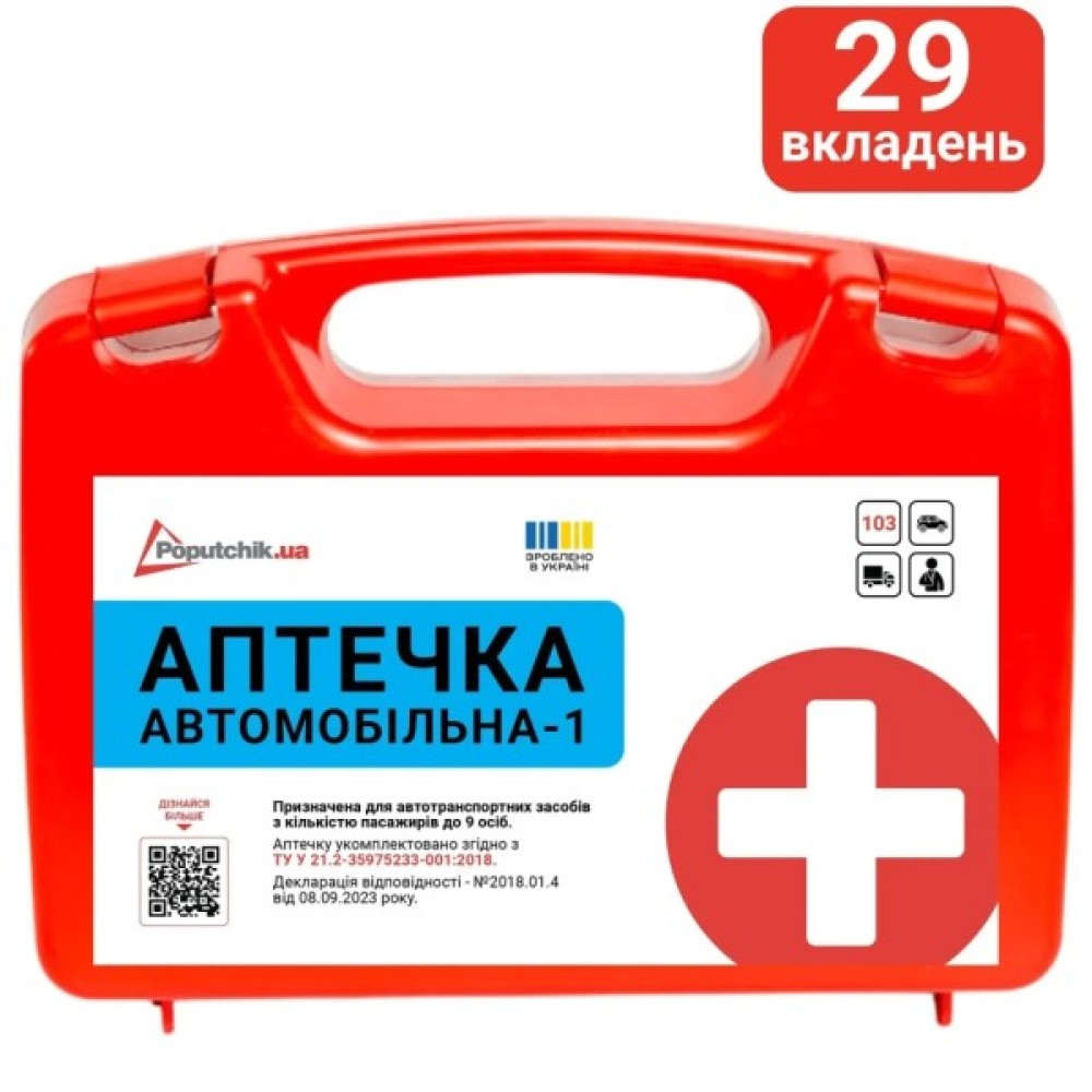 Аптечка Автомобільна-1 до 9 осіб (02-021-П) згідно ТУ У 21.2-35975233-001:2018 призначена для укомплектування легкових, вантажних автомобілів, а також колісних тракторів