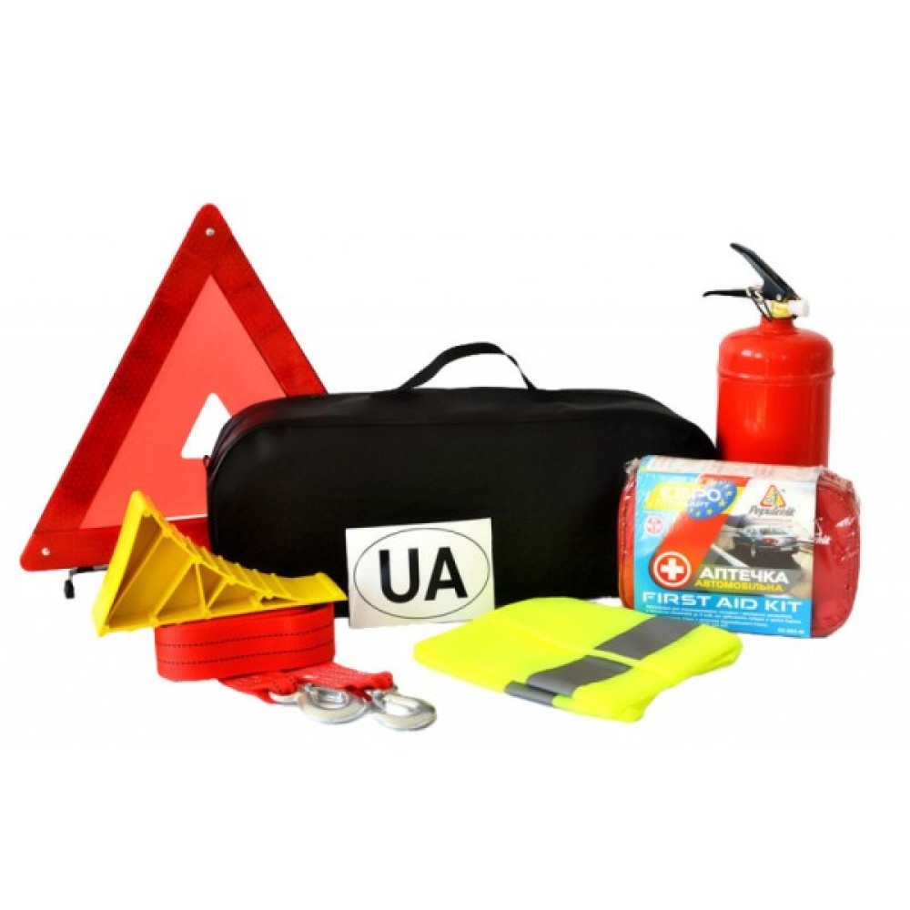 Склад набору аптечка; буксирувальний трос; знак аварійної зупинки; вогнегасник; жилет; сумка-органайзер