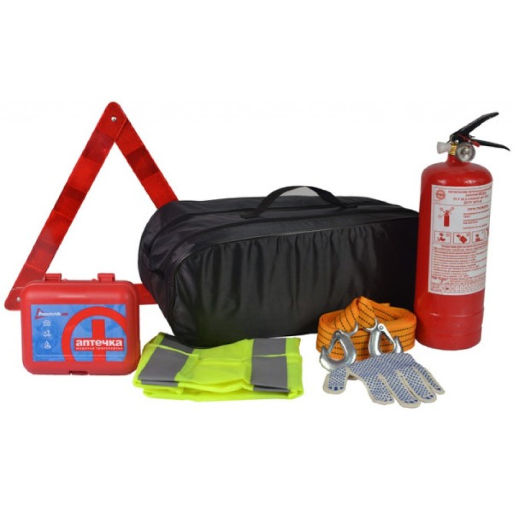 Склад набору аптечка; буксирувальний трос; знак аварійної зупинки; вогнегасник; рукавички; жилет; сумка-органайзер