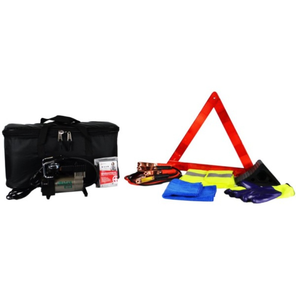 Склад набору знак аварійної зупинки; рукавички; жилет; сумка-органайзер; компресор; упор; серветка; провода прикурювачі; термопокривало