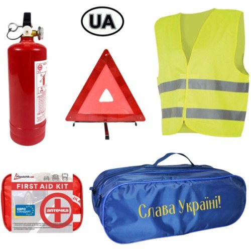 Комплектація інструкція з використання; автомобільна аптечка "Євростандарт" згідно ТУ (50-005-М-IS), в м'якому футлярі; знак аварійної зупинки 41.5 х 41.5 см; сигнальний жилет зелений; вогнегасник порошковий Рубіж 2 кг; сумка-органайзер синя "Слава Україні", на 2 відділення 50 х 18 х 18 см