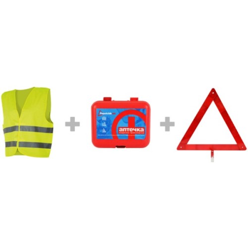 Комплектація знак аварійної зупинки 41.5 х 41.5 см; сигнальний жилет зелений; аптечка транспортна згідно ТУ (02-003-П), в пластиковому футлярі