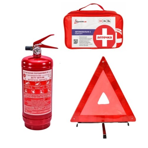 Склад набору аптечка; знак аварійної зупинки; вогнегасник