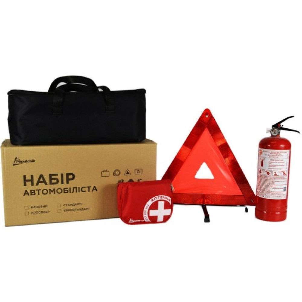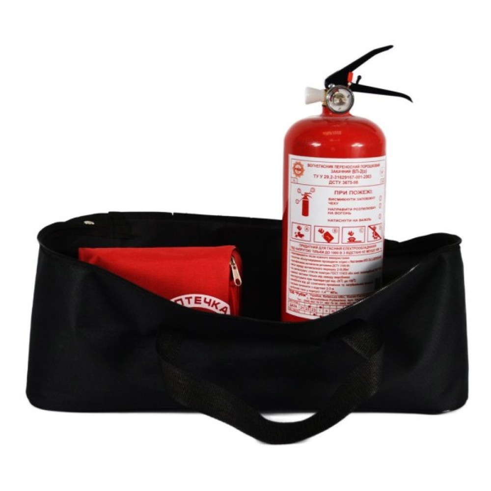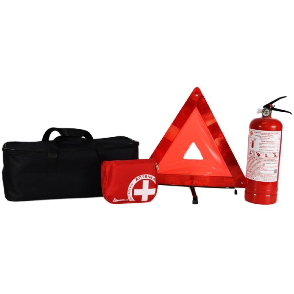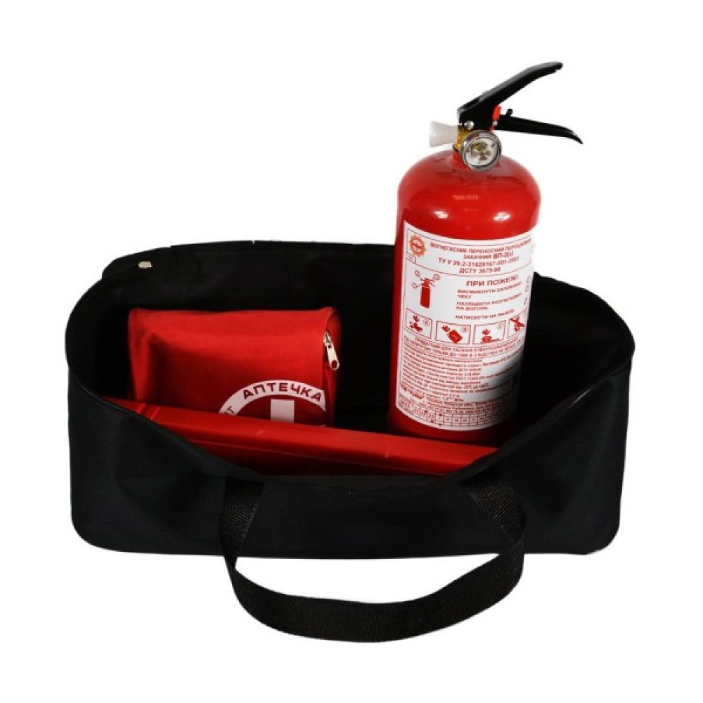 інструкція з використання; автомобільна аптечка "Євростандарт" згідно ТУ (50-005-М-IS), в м'якому футлярі; знак аварійної зупинки 41.5 х 41.5 см; вогнегасник порошковий ВП-2 2 кг; сумка чорна, на одне відділення 45.5 х 18.5 х 18 см