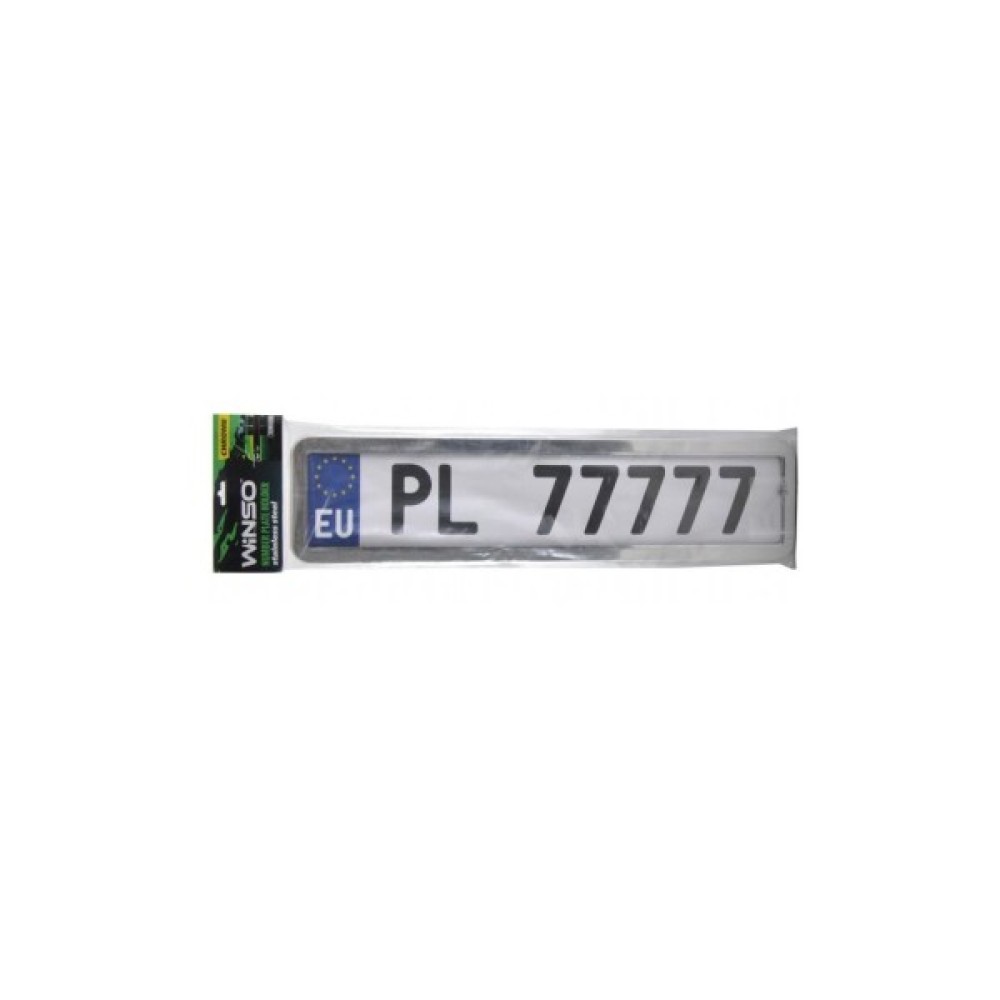 Рамка номерного знака універсальна Winso 142000. Це автомобільний аксесуар, який утримує і зберігає державний номерний знак на місці. Підходить для усіх моделей автомобілів, для номерних знаків міжнародного стандарту. Рамка номерного знака міцна і проста в установці на відповідні стандартні кріплення автомобіля. Ця рамка тонка, гладка, хорошої якості, зроблена з нержавіючої сталі. Стійка до атмосферних впливів.