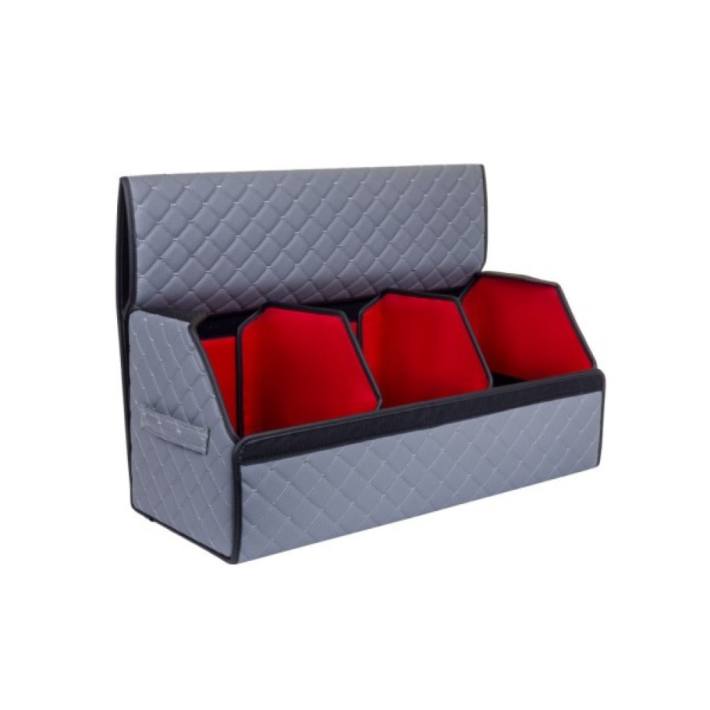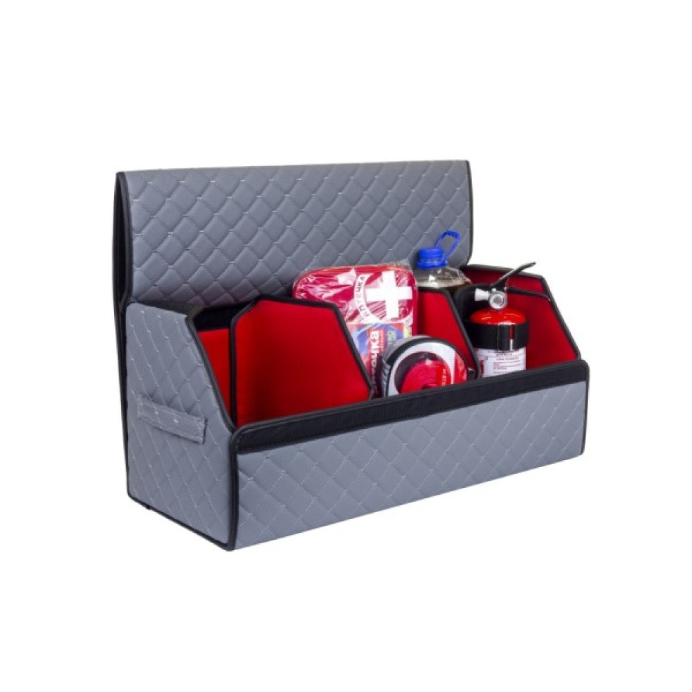 Органайзер для авто EVAtech ECO L — зручно зберігайте всі необхідні речі, організувавши і звільнивши простір у багажнику. Розбірна конструкція Органайзер у багажник виконаний з матеріалів, що мають водовідштовхуючі властивості. Чорний колір органайзеру та підкладу у поєднанні зі шкіряною текстурою та армуючими нитками мають естетичний вигляд. Для міцності край оброблено чорною стрічкою з екошкіри.