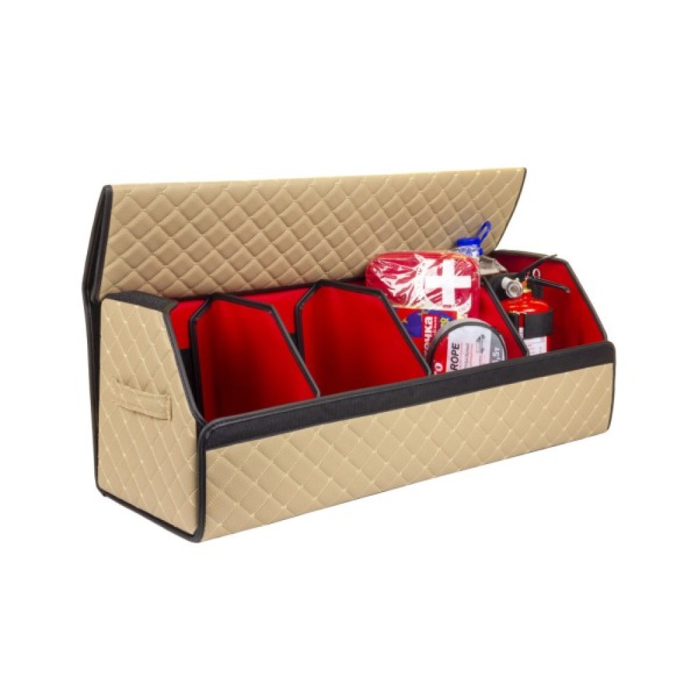 Органайзер для авто EVAtech ECO XL — зручно зберігайте всі необхідні речі, організувавши і звільнивши простір у багажнику. Розбірна конструкція Органайзер у багажник виконаний з матеріалів, що мають водовідштовхуючі властивості. Чорний колір органайзеру та підкладу у поєднанні зі шкіряною текстурою та армуючими нитками мають естетичний вигляд. Для міцності край оброблено чорною стрічкою з екошкіри.