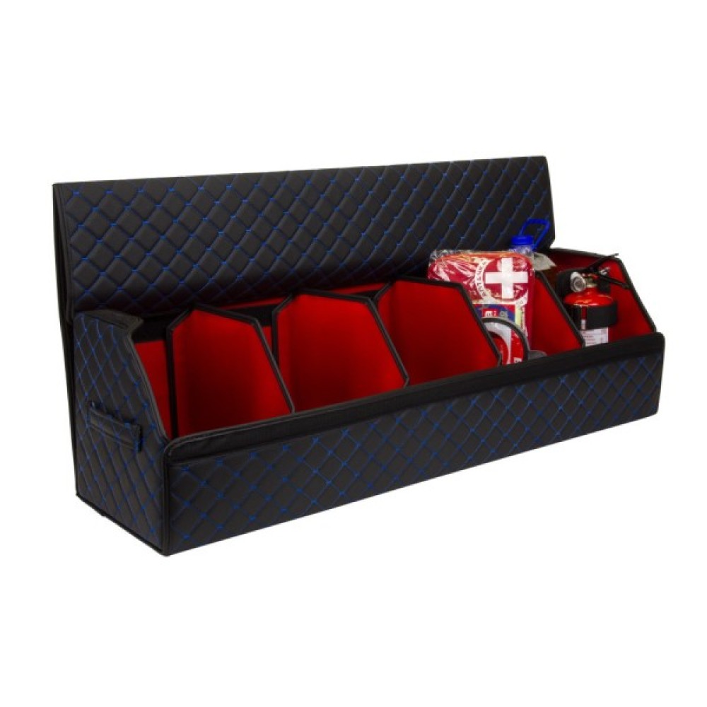 Органайзер для авто EVAtech ECO XXL — зручно зберігайте всі необхідні речі, організувавши і звільнивши простір у багажнику. Розбірна конструкція Органайзер у багажник виконаний з матеріалів, що мають водовідштовхуючі властивості. Чорний колір органайзеру та підкладу у поєднанні зі шкіряною текстурою та армуючими нитками мають естетичний вигляд. Для міцності край оброблено чорною стрічкою з екошкіри.