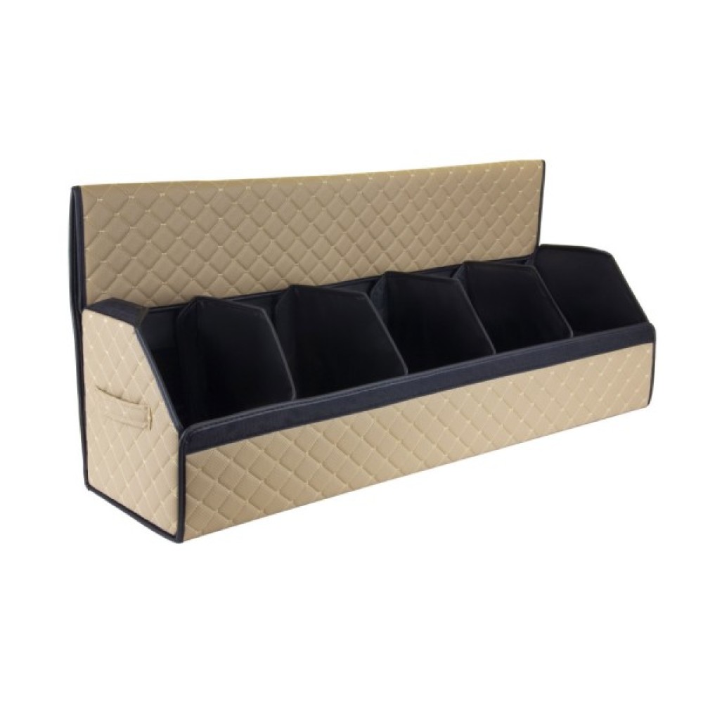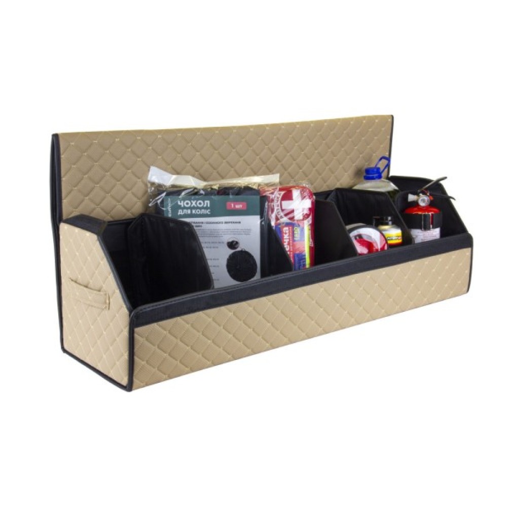 Органайзер для авто EVAtech ECO XXL — зручно зберігайте всі необхідні речі, організувавши і звільнивши простір у багажнику. Розбірна конструкція органайзер у багажник виконаний з матеріалів, що мають водовідштовхуючі властивості. Чорний колір органайзеру та підкладу у поєднанні зі шкіряною текстурою та армуючими нитками мають естетичний вигляд. Для міцності край оброблено чорною стрічкою з екошкіри. Саквояж EVAtech ECO легкий і зручний у використанні, швидко складається і фіксується на міцні липучки. Всередині з обох боків вшиті резинки для фіксації речей, ззовні по бокам сумка оснащена двома ручками для зручного транспортування. Додатково використано систему липучок на дні та збоку для надійної фіксації органайзера у багажнику.