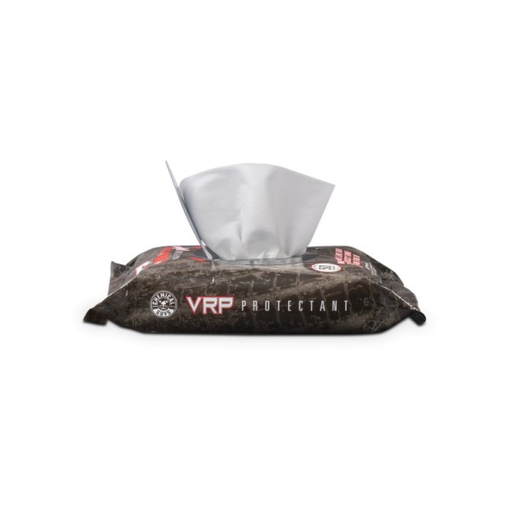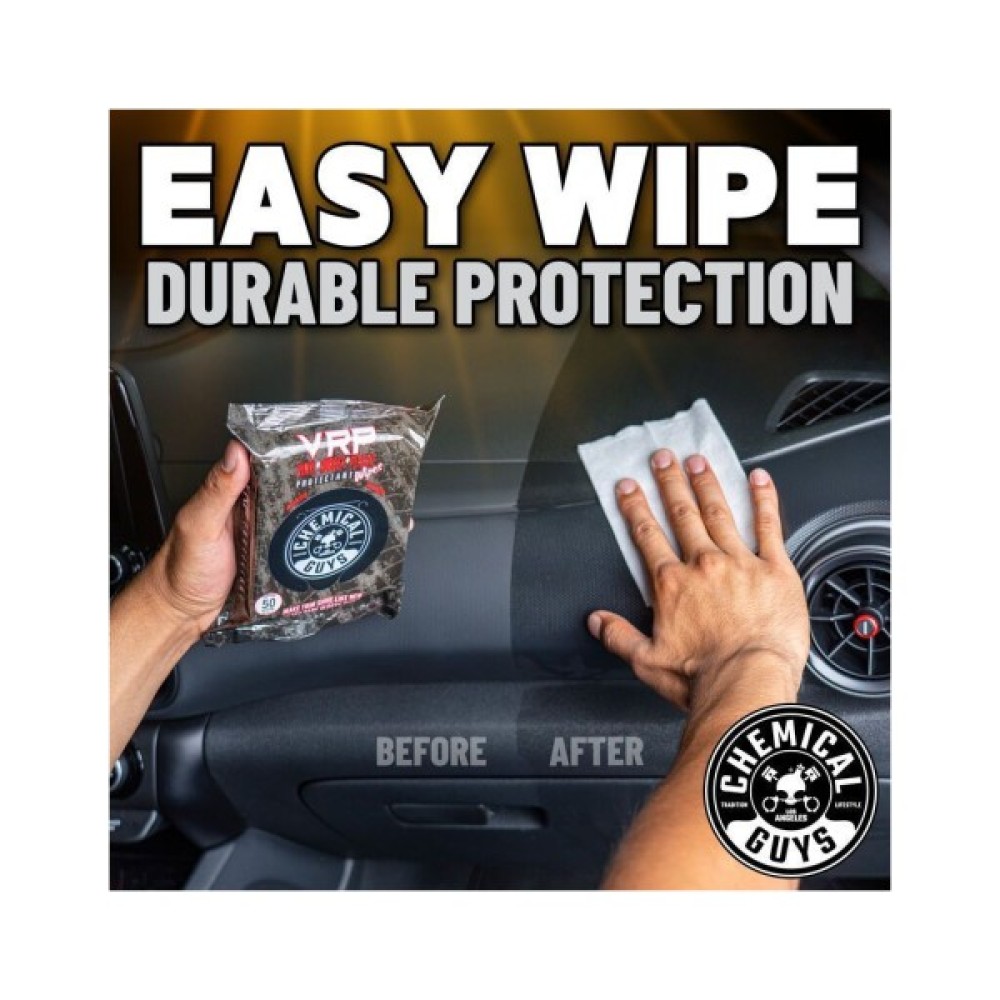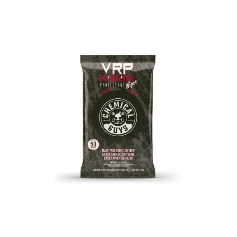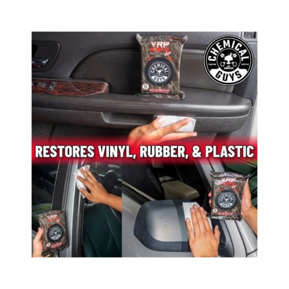 Серветки Chemical Guys VRP Protectant відновлюють блиск чорної поверхні ваших виробів з вінілу, гуми та пластику і створюють надійний захисний шар від шкідливих УФ-променів, пилу та бруду. Вигорілі, сірі та вивітрені поверхні з вінілу, гуми та пластику псують вигляд будь-якого автомобіля. Легко очистіть поверхню, надайте глибокого чорного блиску і оновіть вигляд поверхонь навіть під час руху за декілька секунд за допомогою серветок VRP Protectant! Прості у використанні, одноразові серветки видаляють легкий пил, бруд, відбитки пальців та багато іншого. Ідеально підходять для використання на приладових дошках, дверних панелях, центральних консолях та навіть зовнішніх дзеркалах, і оббивці. Серветки VRP Protectant від Chemical Guys - це засіб для догляду, який кожен повинен мати під рукою!