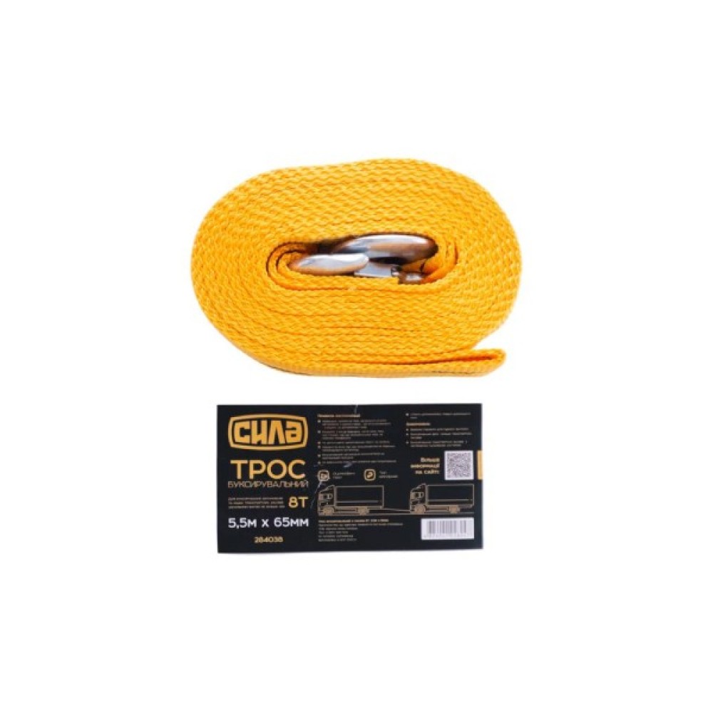 Буксирувальний трос СИЛА 284038 - це надійний і міцний трос, який здатний витримувати навантаження до 8 тонн. Трос має довжину 5.5 метри і ширину 65 мм, що робить його ідеальним для буксирування автомобілів та інших транспортних засобів.