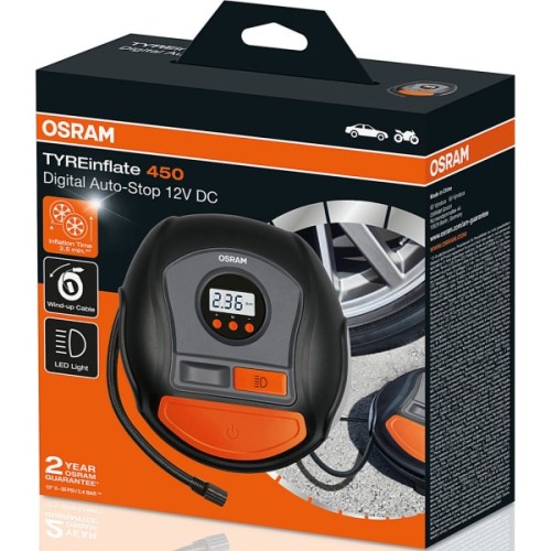 Компресор OSRAM OTI450 призначений для уникнення випадкових ушкоджень, зокрема пробиття або спущеного колеса. Незамінний пристрій в транспортному засобі для тих, кому важливе безпечне і комфортне використання автомобіля. Без проблем піднімає тиск в шинах до необхідного рівня за рахунок великого максимального тиску, який становить 6.9 атм. Компресор є однопоршневим з цифровим манометром, що дозволить орієнтуватися на показники і з легкістю піднімати тиск до потрібного рівня. Завдяки довжині кабелю живлення і довжині повітряного шланга, є можливість використовувати прилад на пристойній відстані від необхідного колеса. Корпус виготовлений з міцного матеріалу, який збільшує надійність пристрою, а також збільшує максимальний час експлуатації. Пристрій використовується тоді, коли з різних причин в автомобільних шинах тиск стає менше нормального рівня. Досить якісна і дорога гума може піддаватися проколу шини, або стиснене повітря має можливість почати проникати через покришки. Для уникнення таких ситуацій використовується компресор.