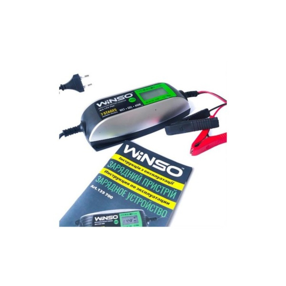 Інтелектуальний зарядний пристрій WINSO 139700 необхідно для зарядки мото - і автомобільних акумуляторів (АКБ). Зарядний пристрій – універсальне, що дозволяє заряджати свинцево – кислотні, літієві, гелеві, лужні акумулятори. Використовується для акумуляторів мотоциклів, автомобілів, катерів та іншого транспорту з напругою мережі 6/12 Ст. Зарядний пристрій виробляє зарядку в автоматичному режимі, LCD дисплей показує режим зарядки батареї. Режим заряду виставляється кнопкою MODE.